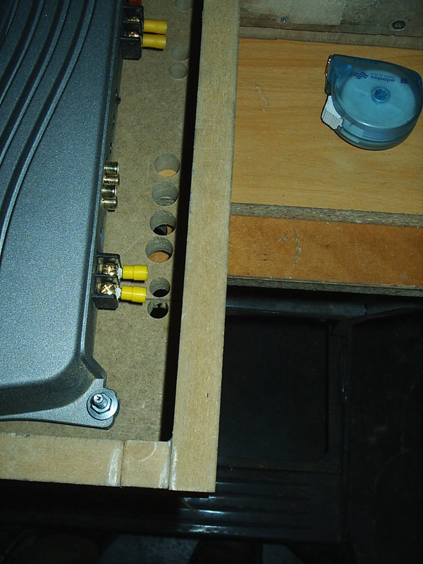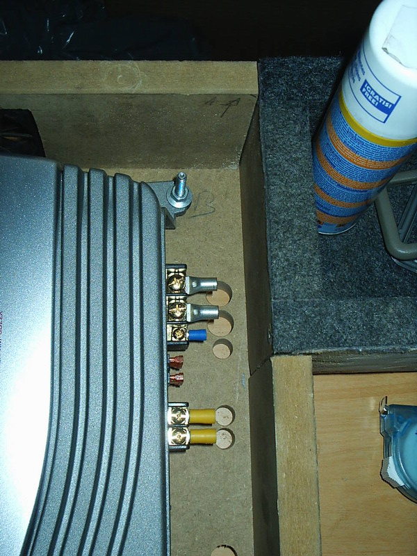 Bastidor de la etapa que moverá los subwoofers, aún inacabada pero con los ventiladores montados y pegados, los agujeros hechos con broca de pala para pasar cada cable y los terminales que irán en cada sitio a modo de prueba: