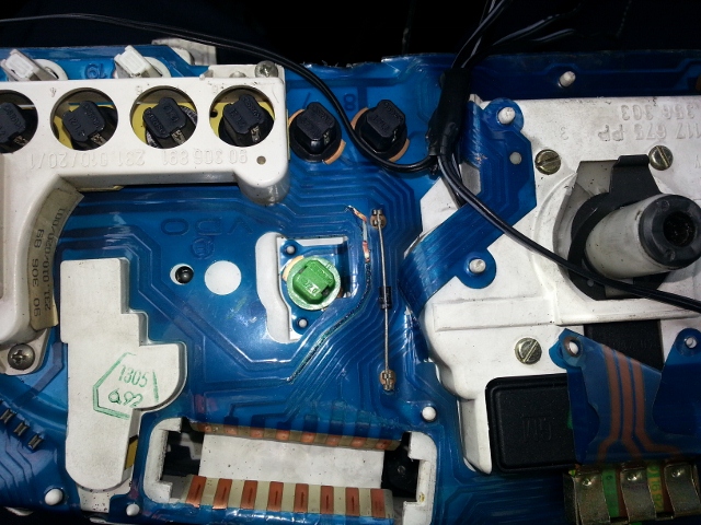 pongo una foto del problema,unas cuantas semanas que la aguja las revoluciones iva a su aire,a relantinde 900 a 2500 y al acelerar casi davala vuelta al cuadro ,saque el cuadro al dar la vuelta vi que una pista junto al casquillo verde estaba quemada.