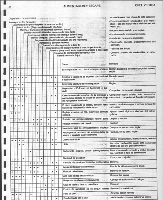 Buenas, veo que muchos tenemos problemas diferentes en la alimentación y el escape...así que aquí dejo la página del manual de taller del Vectra A sobre el diagnóstico de anomalías en estos casos.