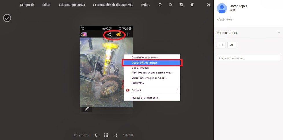 Esta aplicación me parece tremendamente útil, ya que guarda automáticamente (bajo configuración opcional) una copia de TODAS las fotos que hagamos con nuestro Smartphone en la nube de google, es decir, en nuestra cuenta de Google+. Con este sistema, ni siquiera tenemos que subir manualmente las fotos. Abrimos nuestra cuenta de Google+, damos a la pestaña "Fotos", y allí están nuestras imágenes. Para subir una foto al foro, solo hay que clikar encima de ella y CUANDO SE ABRA hacer click con el botón derecho y "Copiar URL de imagen". Después solo pegar el texto en la herramienta de carga de imagenes del foro. Facil facil...