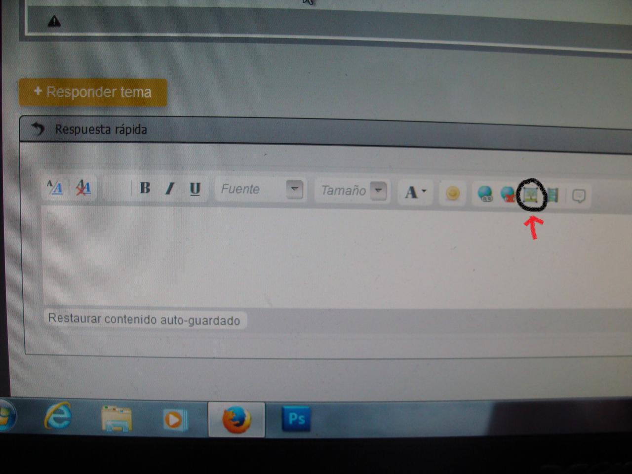 mira es esta:Archivo adjunto 42644luego la seleccionas desde el ordenador o desde una url,cargar y listo.Yo lo hago así,no se si se hace de otras maneras,yo también soy nuevo.Creo que también hay un apartado para provar a poner fotos y esas cosas.Espero haberte servido de ayuda