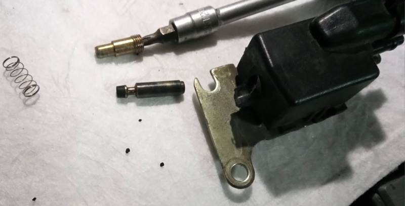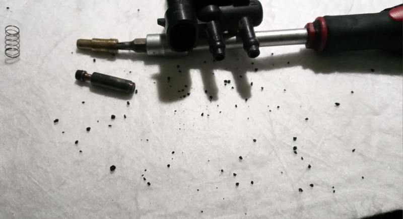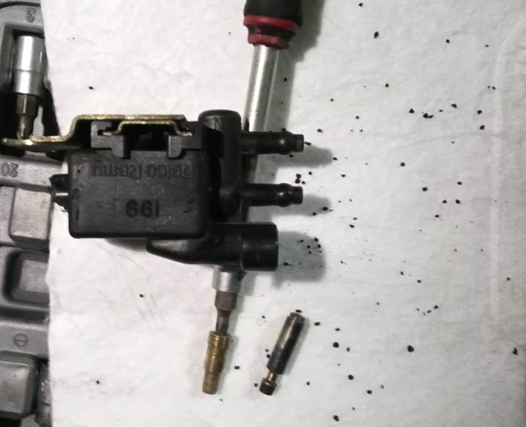 Esta válvula resulta que iba con tornillo torx debajo del tapón que la sella, ningún problema. Fuera tornillo, fuera muelle, y fuera vástago. Ahí ya cayeron algunos granos de carbón. Pero cuando intento soplarle por las dos boquillas y por el agujero del tornillo, imposible, está atorada. Incluso entre las dos boquillas no podía pasar el aire. Un alambre fino y tres o cuatro trasteos con cuidado y no veáis lo que salió de ahí. Bueno, sí lo vais a ver porque os pongo fotos. Los granillos de carbón la tenían atascada completamente, mucho peor que la del Vectra GT. Por lo menos esta no dejaba pasar el aire siempre como la otra.