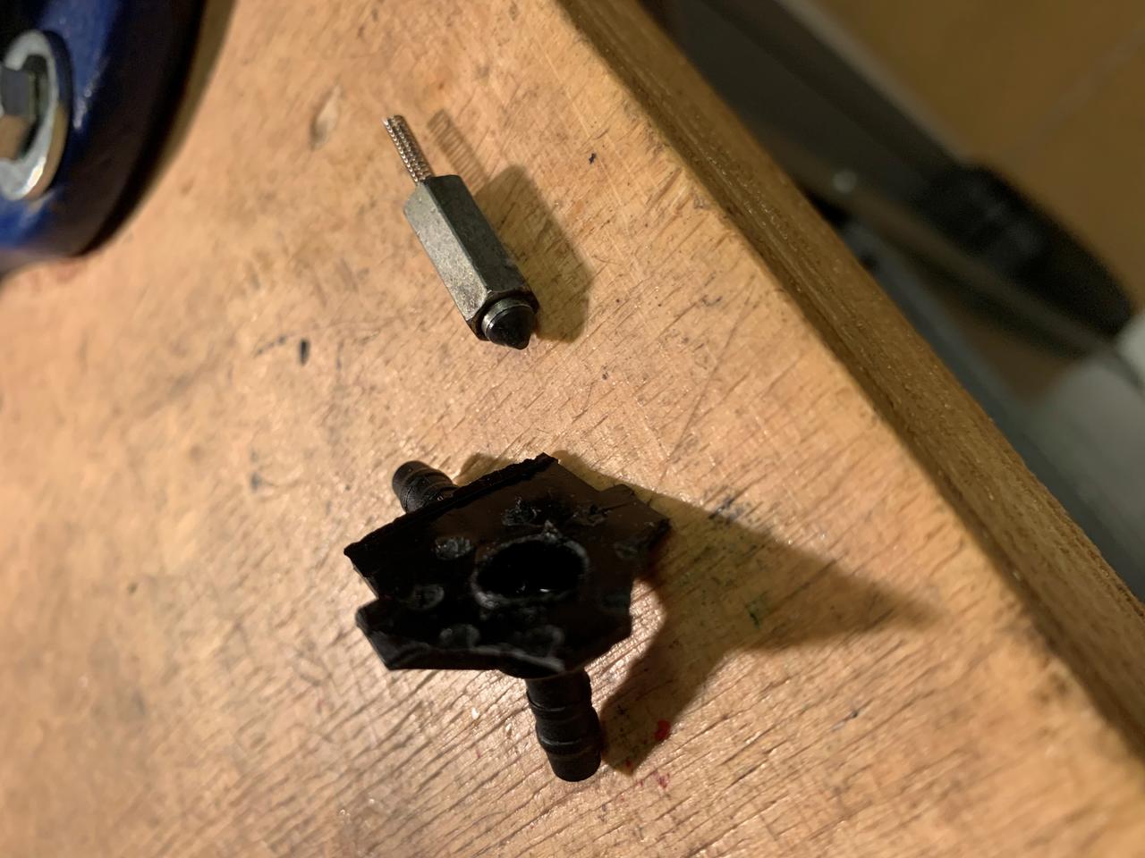 Además soplando por el otro trozo de tubo negro que seguía unido al cánister descubro que también está atascado. Lo dejo para otro día, pero ahora le voy a montar el minifiltro de aire a la salida del cánister para evitar que se vuelva a meter el granulerío por el tubo.