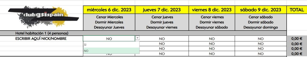 - En la primera Casilla escribid vuestro nombre completo y vuestro NICK, para identificaros rápidamente, y seguidamente, id clickando las celdas (saldrá un desplegable) y seleccionad los días que vengáis poniendo "SI" o "NO". Dependiendo del numero de días, y del tipo de habitación escogida, tendremos el precio total al final de la selección.