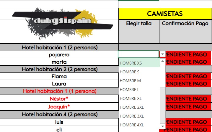 En el excel se ha habilitado, junto donde os apuntasteis para el alojamiento, un nuevo desplegable donde seleccionar vuestra talla. Prácticamente están todas las tallas, tanto para niño como adulto, solo hay que seleccionarla.