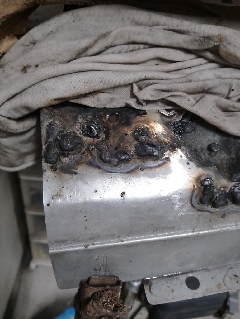 Fue un quita-paciencias soldar con electrodo por los agujeros, pero es lo que tenía. También fue un impedimento que he conservado la pintura visible de la aleta y tenía que estar con ese trapo mojado todo el rato para refrigerar y no dañar la pintura.