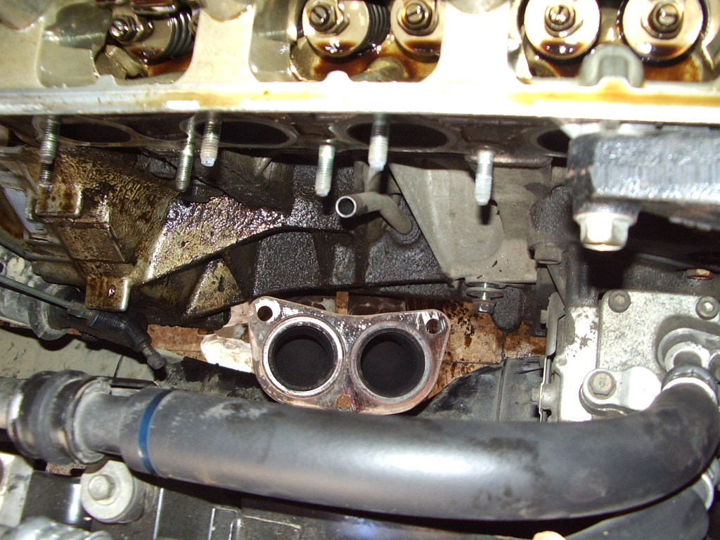 Colector de escape fuera, al loro con los 2 cañones que bajan hacia abajo, no se aprecia el tamaño, pero el diametro es bien grande... Aqui podeis observar en parte la pérdida de aceite que tenía por el retén del arbol de levas, cosa que no me extraña, porque estaba puesto fatal... el resto del aceite es de sacar la válvula del VTEC