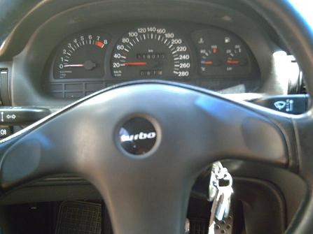 -Logotipo volante turbo, cuadro de calibra turbo y agujas rojas.