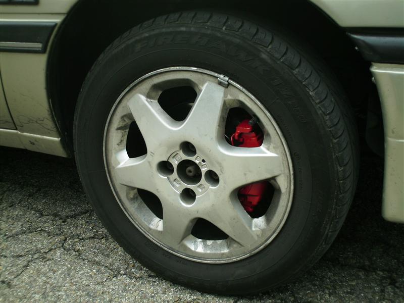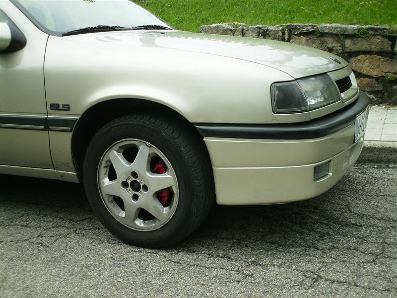 El otro dia mientrasesperaba a mi novia que estaba en la peluqueria, me dediqué a pegarle una buena limpieza al vectra. Y como tardaba demasiado, dije.... tengo pintura anticalorica roja desde hace meses en el maletero...y si pinto en un momento las pinzasde freno... asi que me lié a desmontar rueda y pinzas, lavado a conciencia, y pintar a base de spray anticalorico...y el resultado: