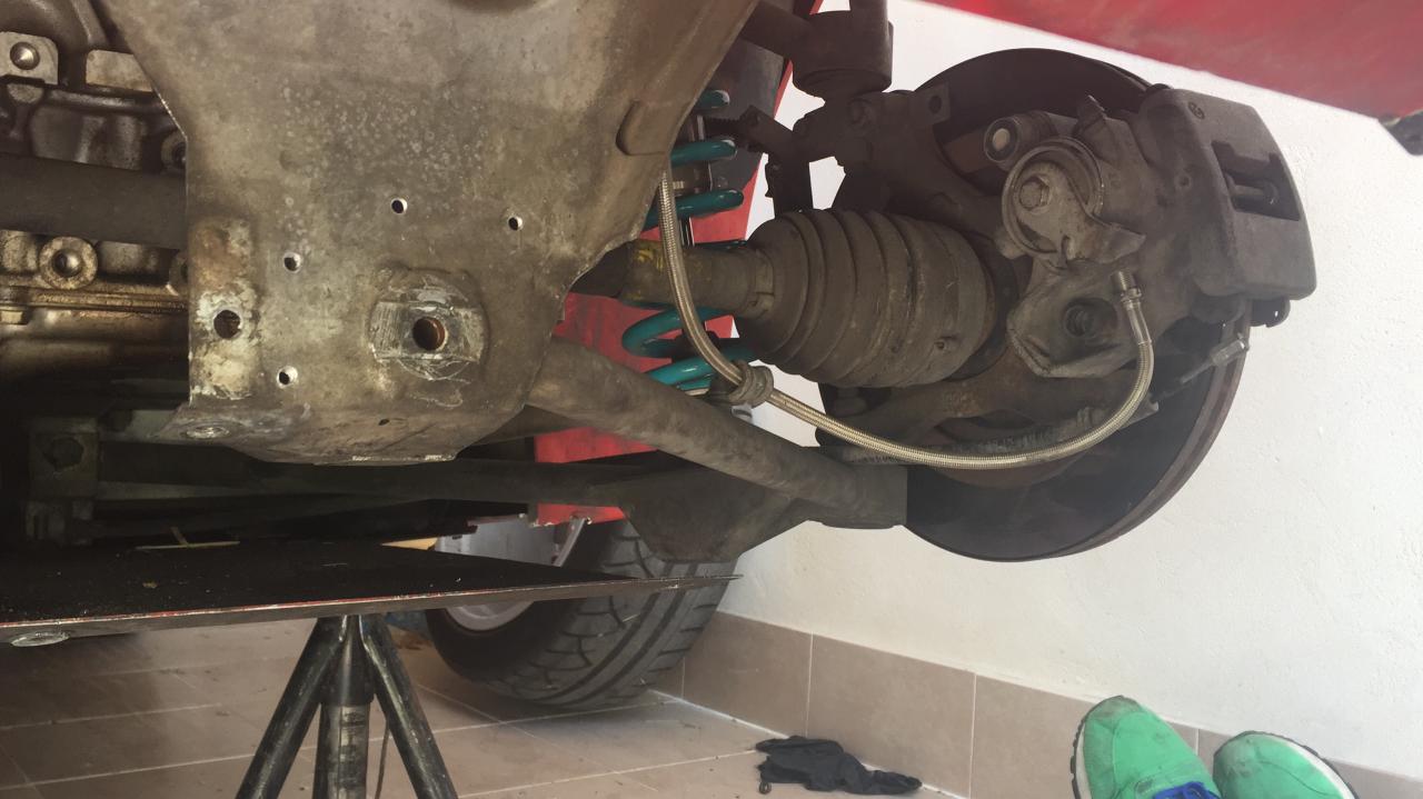 Cambie los discos y pastillas delanteras y traseras. Aproveche y subí el tamaño de disco a 308 mm, de serie lleva 288 tanto delante como atrás. Para poder subir de tamaño el disco tan solo hace falta comprar unos separadores de 10 mm para desplazar la pinza hacia fuera. Las pastillas y separadores se compran en especificas de Lotus / Speedster en UK, así que tras esperar un par de semanas te llega a casa sin demasiado problema, (tras pagar una buena morterada con las dichosas pastillas...)