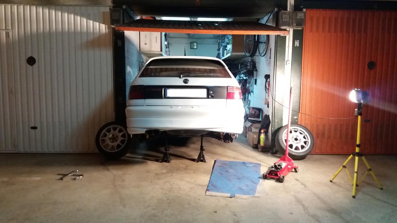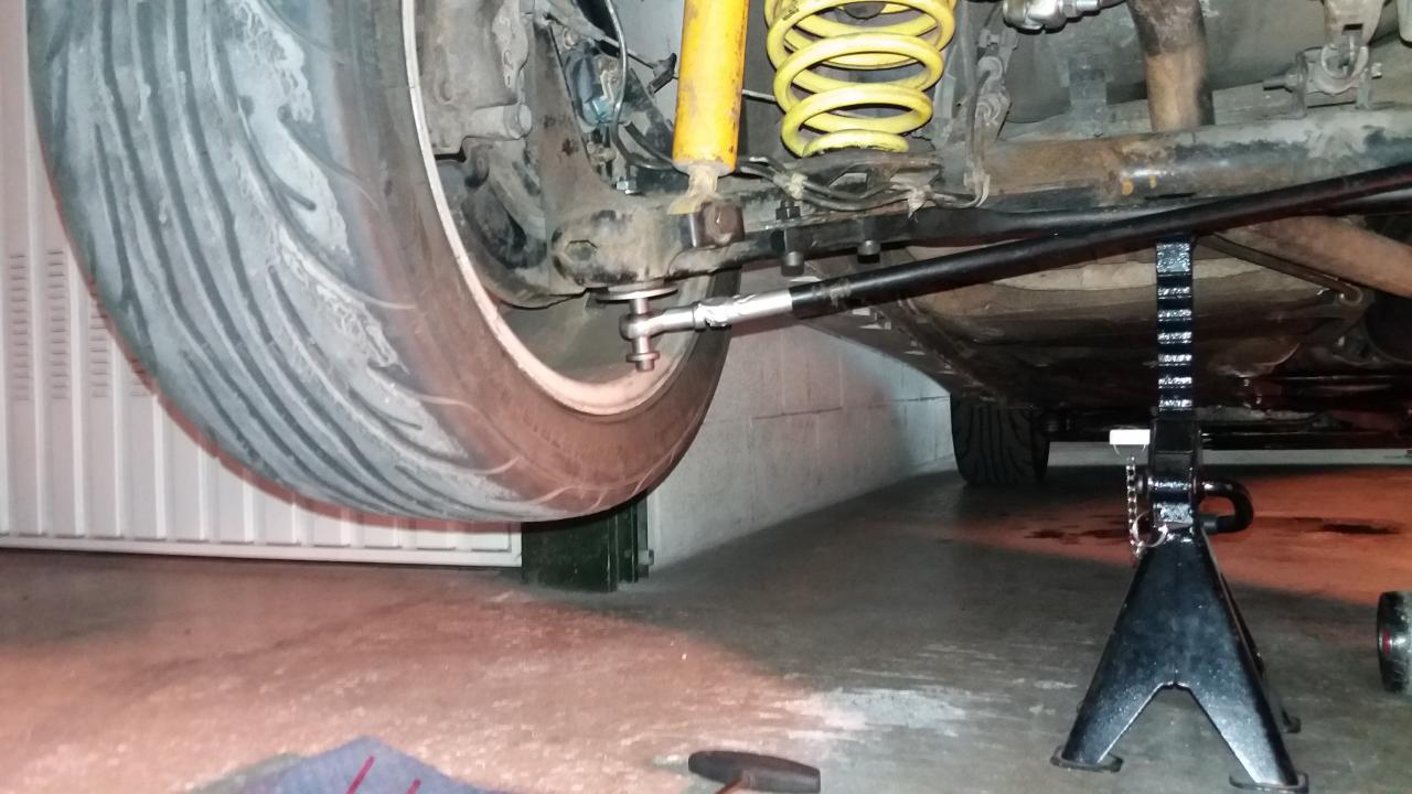 Sobre la estabilizadora, quiero empezar a hacer pruebas con un palier de corsa, aprovechando los estriados. E presentado el palier en su lugar junto con unos soportes/silenblock de estabilizadora delantera sobre el eje trasero, y así a bote pronto no pinta muy complicado el tema. Algo asi:
