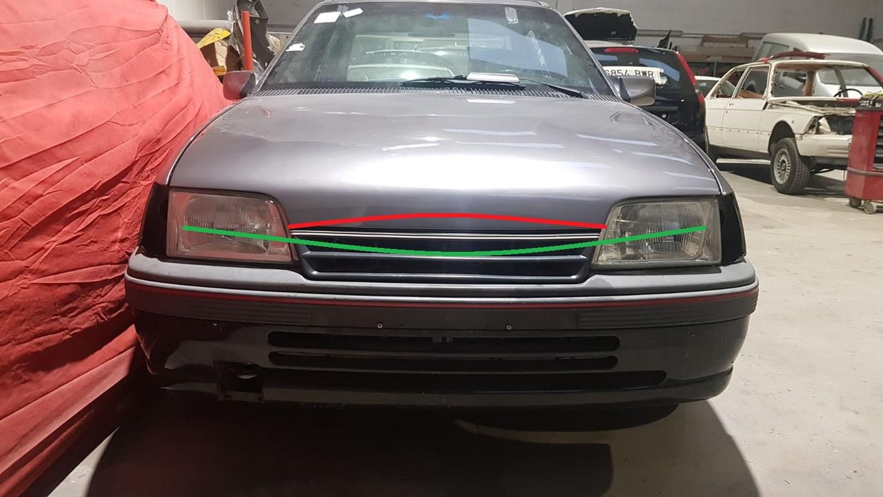 estaba curvado hacia abajo y algo hacia atrás. se ha llevado a su sitio lo máximo posible. ahora la separación entre capó y parrilla es correcta y con los faros ha mejorado mucho.