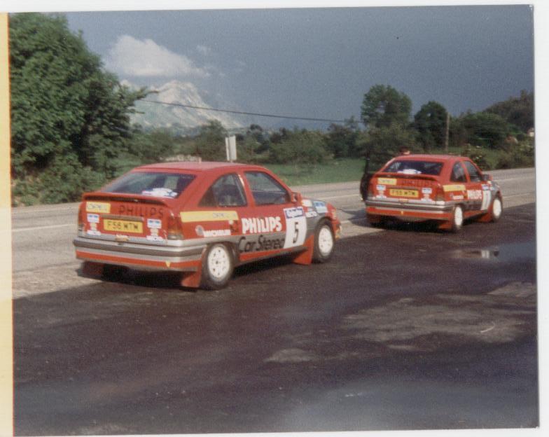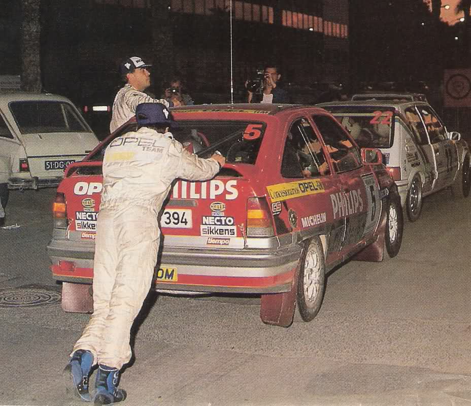 En las fotos que te pongo, aparecen el kadett gsi8v que conducía beny fernandez, y luego alguna de los 16v de Borja Moratla y Beny Fernández. La duda que me surge ahora es si cambiaban el color del interior dependiendo de la decoración exterior, ya que en varias fotos parece verse que las barras son grises y en una en la que aparece beny fernandez empujando el kadett, las barras parecen de color negro.