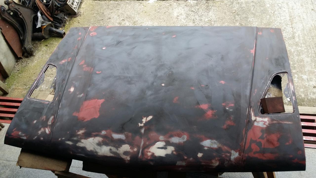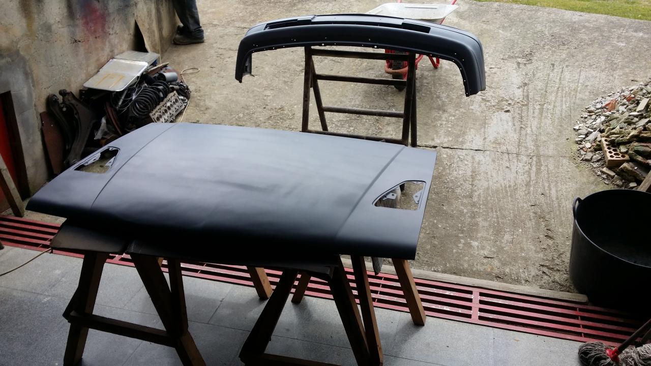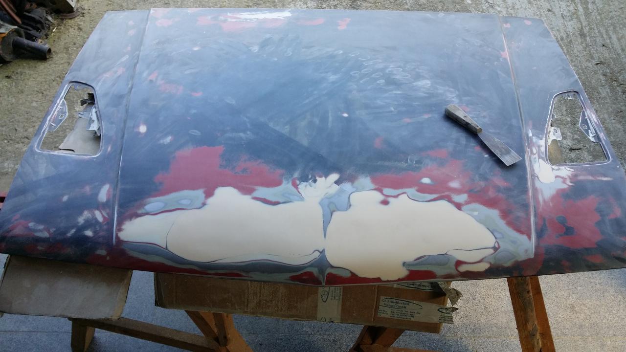 Después de varias pruebas, consultar con varias personas (que al igual que con los métodos, cada uno tenia su teoría del problema) se llegó a la conclusión de que los disolventes del aparejo y de la pintura estaban atacando a los restos de la pintura negra acrílica que tenia el capó. La solución era haber lijado hasta eliminar todo rastro de dicha pintura, pero con la pintura ya mezclada y el proceso en marcha no habia vuelta atrás con lo que seguí con el proceso. El resultado como cabía esperar fue nefasto