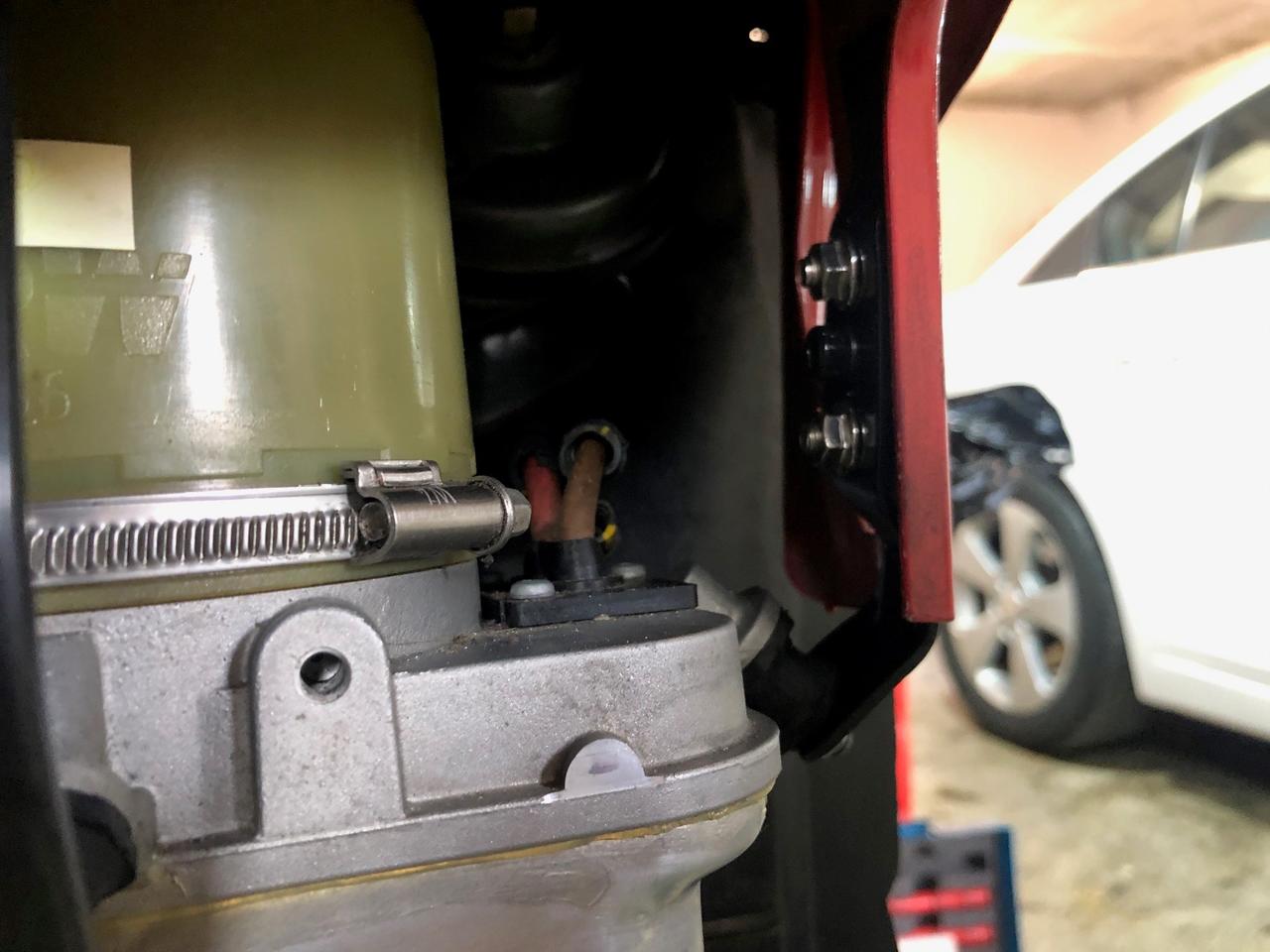 Lo primero era encontrarle su correcta orientación. Tomé la premisa de que las tomas de presión y retorno quedaran mirando hacia el chasis para evitar recorridos innecesarios, pero esto hacía que la instalación quedase en el lado opuesto. No era un problema porque permitía darla la vuelta por detrás sin tocar en el plástico paso de rueda. Otro punto a tener en cuenta era que tenía que estar lo más pegada posible hacia arriba y hacia atrás, pero sin que pegase en el paso de rueda y que permitiera poder quitar el tapón para poder rellenarla. Estuve probando calzándola y con bridas un rato (no sabéis como pesa el mamotreto jaja) hasta que encontré su sitio idóneo.