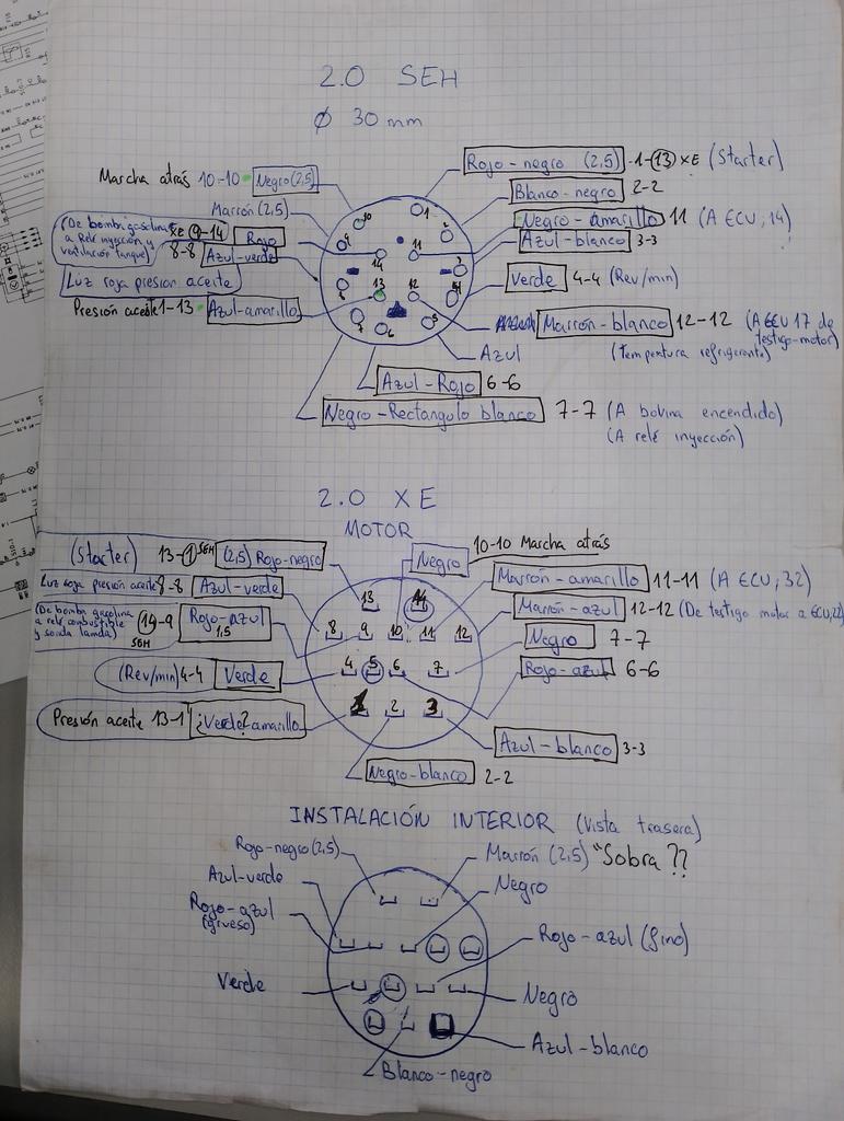 De los 14 cables del SEH me han coincido todos cada numero del pin con el suyo, menos el 1 que es el starter y coincide con el 13 del XE.El 13 del SEH coincide con el 1 del XE, presion de aceite. Y el 14 del SEH coincide con el 9 deXE, bomba de gasolina. El cable marron del SEH me sobra. Y por el pin 5 le he hecho pasar un cable directamente desde el sensor (al lado del termostato) hasta el propio conector, porque no marcaba el cuadro la temperatura del motor.