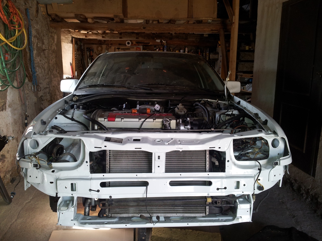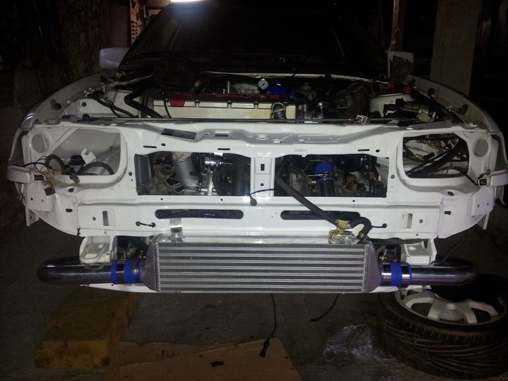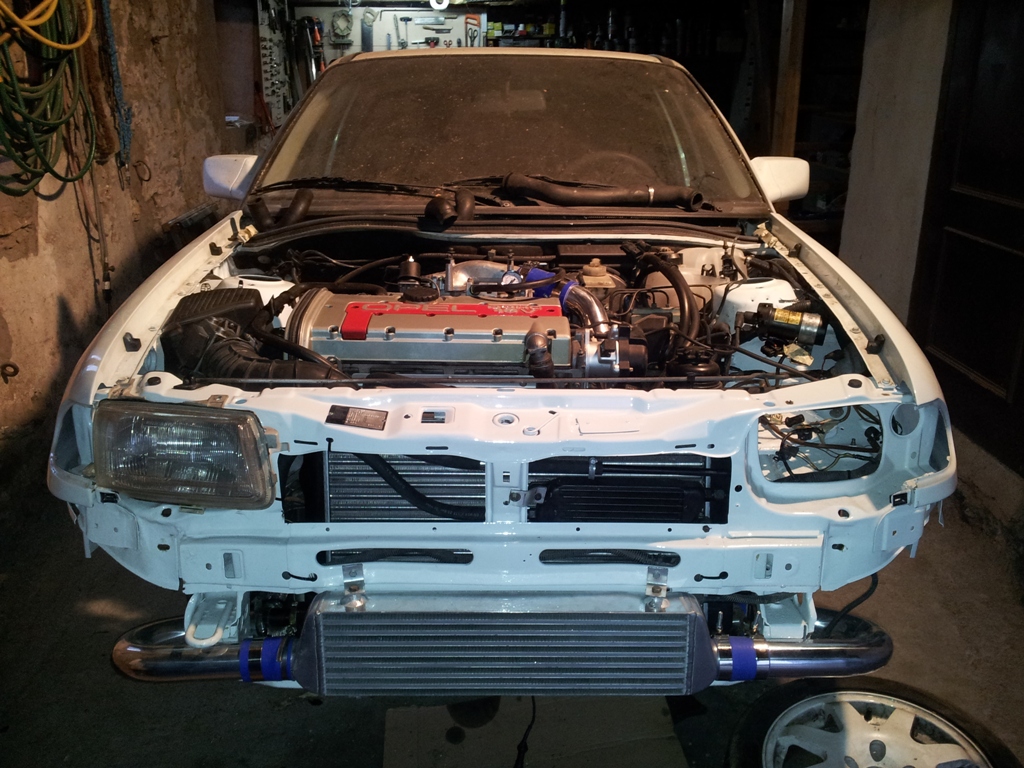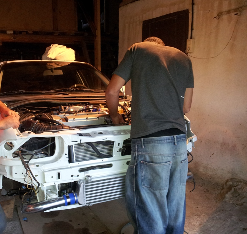 Con el motor dentro , pues lo siguiente fue los radiadores de refrigerante , aceite e intercooler...también la parte eléctrica y las tuberías en general , adaptando lo que era necesario...reuvicación del radiador de aceite , modificación de una manguera de la bomba de la dirección , recorte de filtro de aire original por abajo para que entrara , nuevos soportes , etc etc....