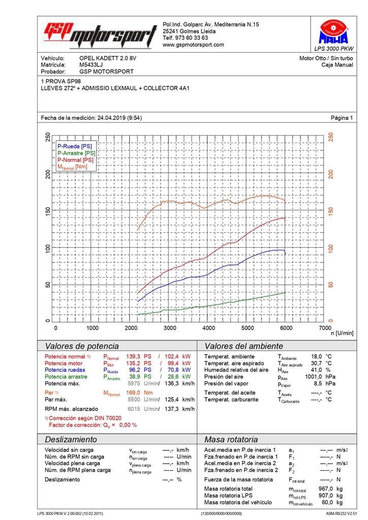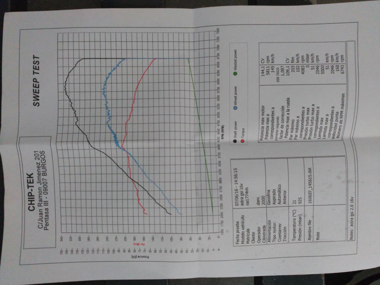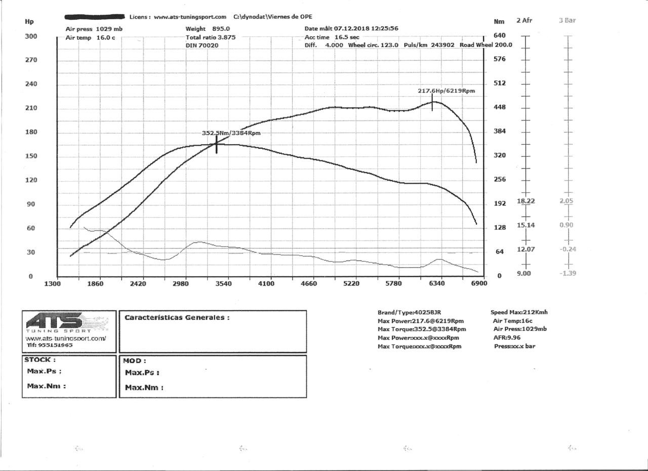 Aquí viene mi gráfica después de tanto el coche ya está operativo.es un motor de kadett un 20xej montdo en un astra.linea de serie con supresor de catalizador para que de asemeje a un kadett de serie.el motor sólo tiene volante de inercia aligerado y filtro green de sustitución
