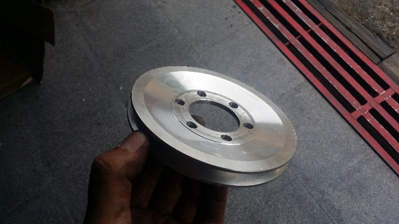 Polea de aluminio casera, unos 340gr de peso frente a los 1800 o asi que pesa la doble original, un ahorro de peso notable