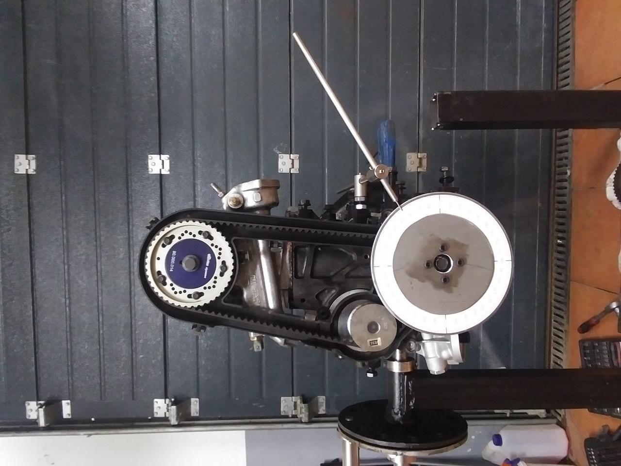 Y para saber cuando el pistón 1 está en PMS podrÃ*a haber comprobado si la marca de la polea es realmente el PMS o no, pero también le hice una pieza para acoplar al piñón del cigüeñal para poder collar otra rueda graduada. Y con la rueda y el comparador + base magnética obtuve el PMS exacto, con esos dos grados y la polea ajustable he podido calar bien la distribución. He intentado que la polea quede bastante centrada para poder adelantar o atrasar el punto, pero si va bien asÃ* se quedará... También he tomado notas de alzadas máximas, inicio y cierre de válvulas para hacerle el diagrama y ver en que punto está exactamente el pistón para ver lo máximo que podrÃ*a retrasar-adelantar el árbol de levas...