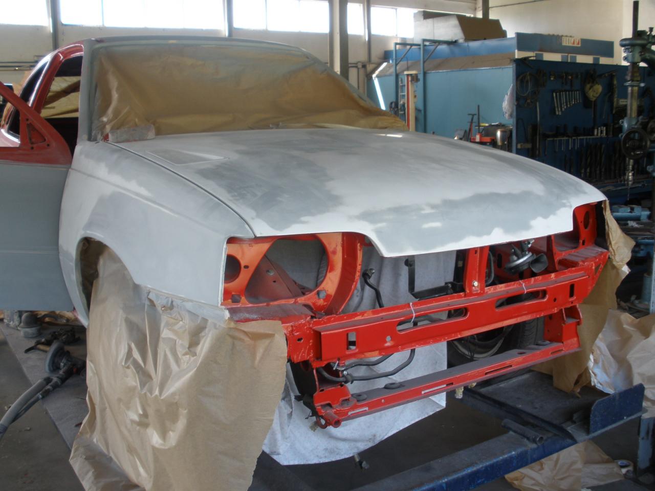 Bueno señores, habemus novedades!! Esta semana se le ha dado bien al chapista y ya me tiene algunas partes casi lista, como el capó. Otras están siendo retocadas, después de dar aparejo. Falta sanear un pequeño óxido de una puerta, retocar las aletas delanteras, el portón u demás, pero bueno, con el aparejo ya va pareciendo otra cosa.