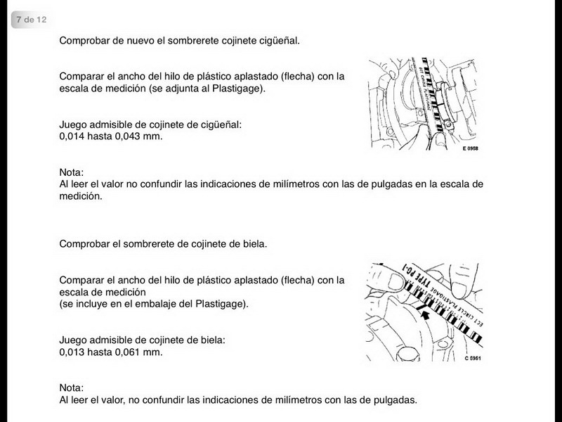 Empecé a medir el estado del cigüeñal con los Plastigauge. Según Opel, la tabla de debajo indica lo que nos podemos permitir. A mí me han dado 3 muñequillas aproximadamente 0,045mm y otras dos 0,050mm (en principio fuera de tolerancia). Si el próximo día que mida las muñequillas de biela está todo más o menos en orden también, tiro para adelante y lo monto.