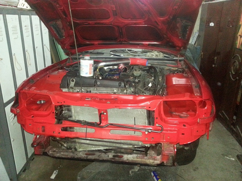 aqui estaba probando como queda la defensa tengo que ecortar un poco la traviesa nada mas para que libre el intercooler. e momento ira asi mas adelantee abrire la boca entera y subire un poco el intercooler que ahora va algo tapado para mi gusto :cool: