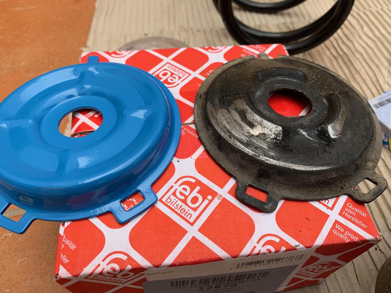 He montado delante unos platillos de muelles Fk, que supuestamente rebajan la altura unos 5mm, también se puede observar que hay dos tipos de rodamientos, unos con sombrerete y otros sin, he montado los que no llevan, se puede apreciar como anteriormente llevaba los otros y rozaban en los platillos.