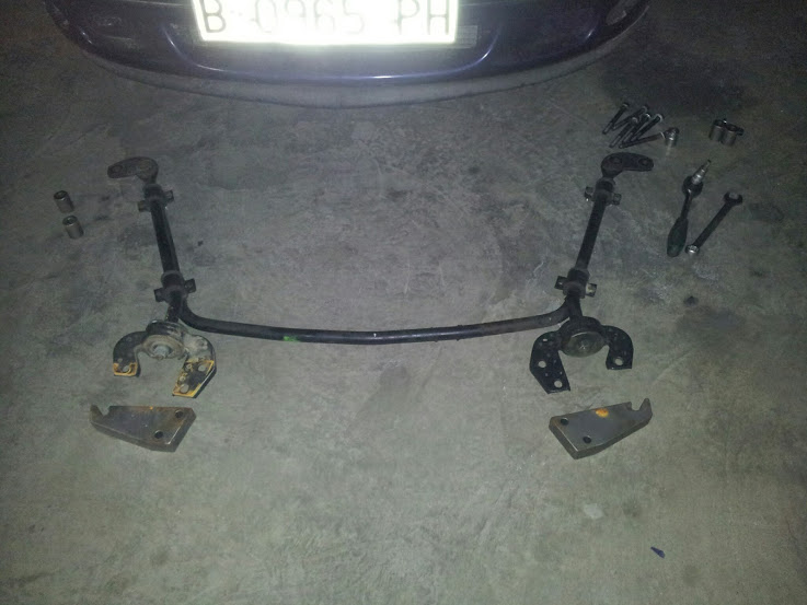 Otra cosa que hay que arreglar es el avance de los trapecios. Al meterle la F28 hubo que suplementar la barra estabilizadora y parece que no ha quedado bien en su sitio. La rueda está deplazada un poco hacia atrás y eso provoca que las ruedas que quiero montar rocen en la parte interior del paso de rueda al girar a tope.