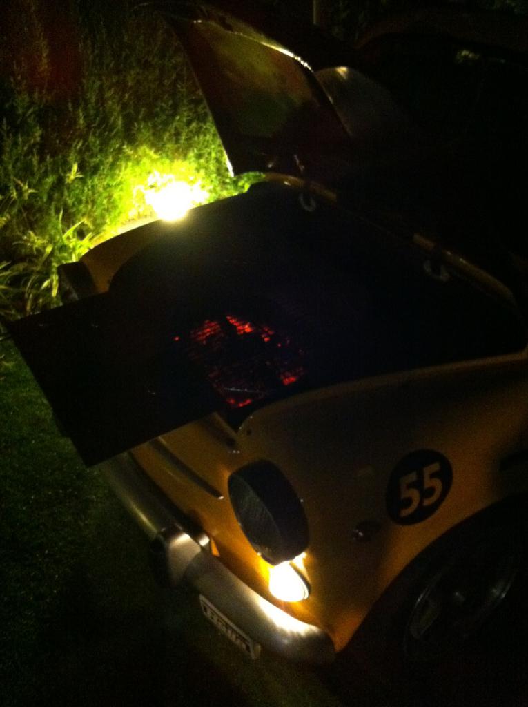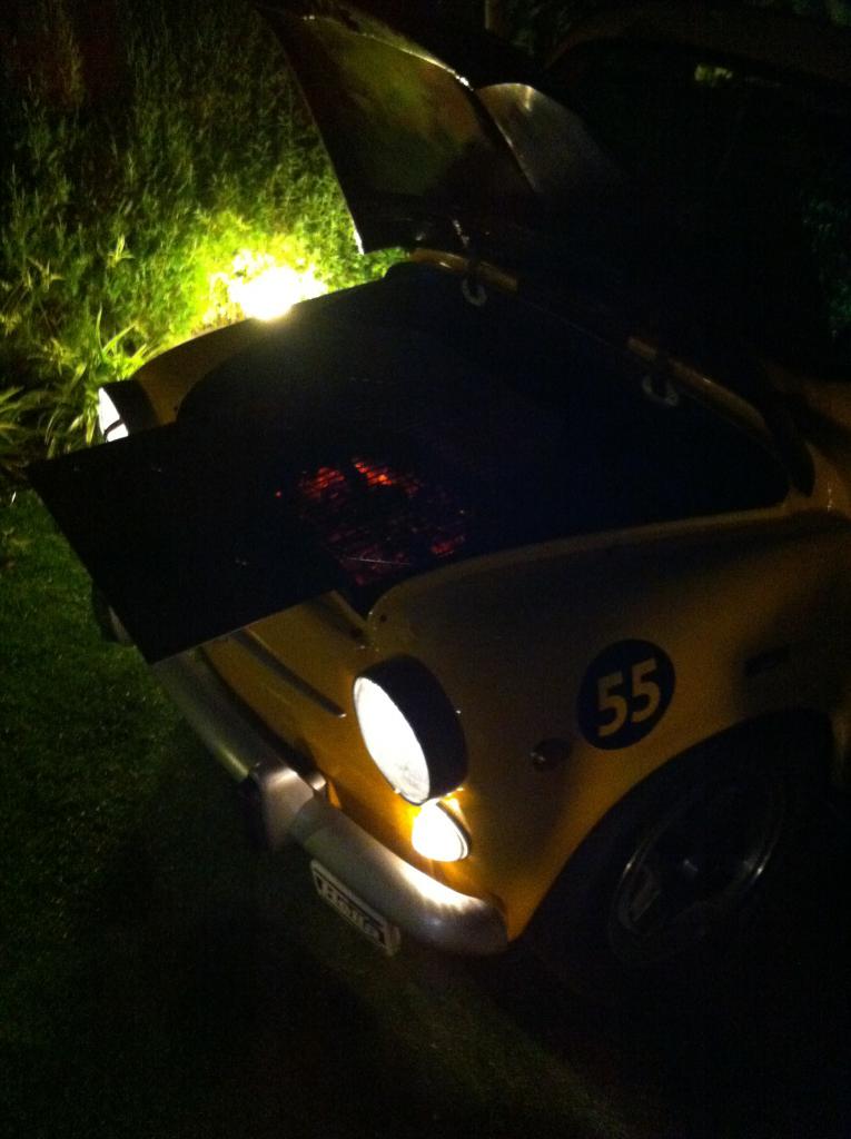Una mesa y unos platos no caben de ancho en ese vano (el capó está levantado del lado derecho, por poner una pega). Lo del filtro que dice Txema lo pensé, pero no se me ocurre un líquido normal con el que hacer una barbacoa y ya jodería que saltara esa pintura tan chula por el calor.