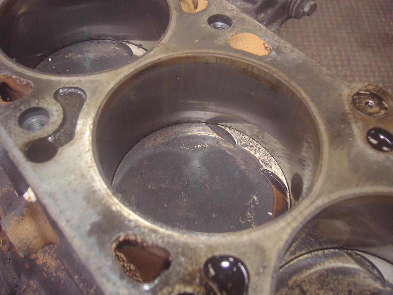 Esta vez traigo malas noticias, la semana pasada levanté culata y pude corroborar que existía un desgaste considerable en todos los cilindros. Hay uno que está peor que el resto, con un montón de rayazos. Creo que estas marcas se pudieron producir al desprenderse algún trozo de cerámica de la bujía y caer en el cilindro, en una de las fotos que adjunto se ven claramente las marcas tanto en el pistón como en el cilindro.