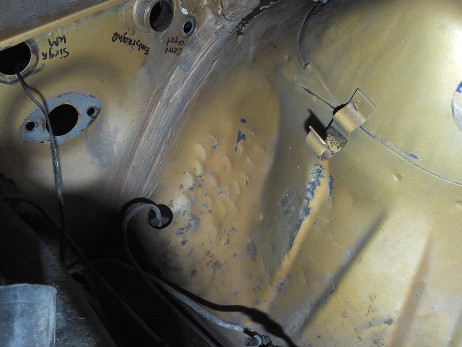 Un problema que tiene el Kadett C es que el servo es muy pequeño, de 7'', y no admite bombas mayores para poner pinzas grandes. Se suele forzar un poco la carrocería para meter servos de 8'' de Opel GT o Manta que sí admiten bombas mayores. Pero al mío se ve que se le estropeó el servo y le habían puesto otro mayor de 9'', a costa de meter martillazos en el paso de rueda en plan cerdo... se ven los bolazos en la chapa cosa fina, a ver cómo me arreglo para alisarlo un poco. De lo malo me cabe casi de todo, estoy pensando en poner un equipo de Corsa C o Meriva, que ya tienen el depósito con salida para el embrague hidráulico.