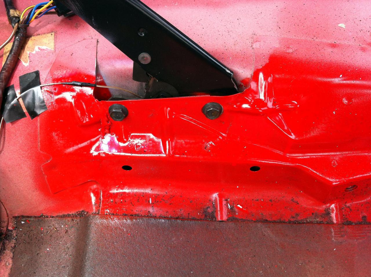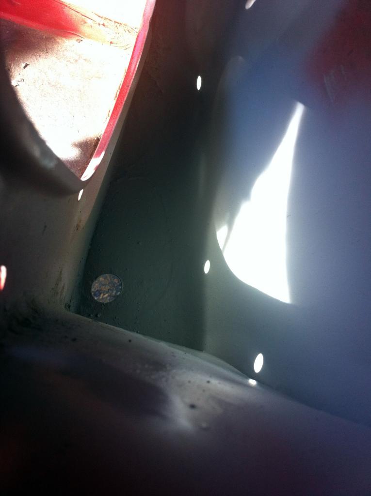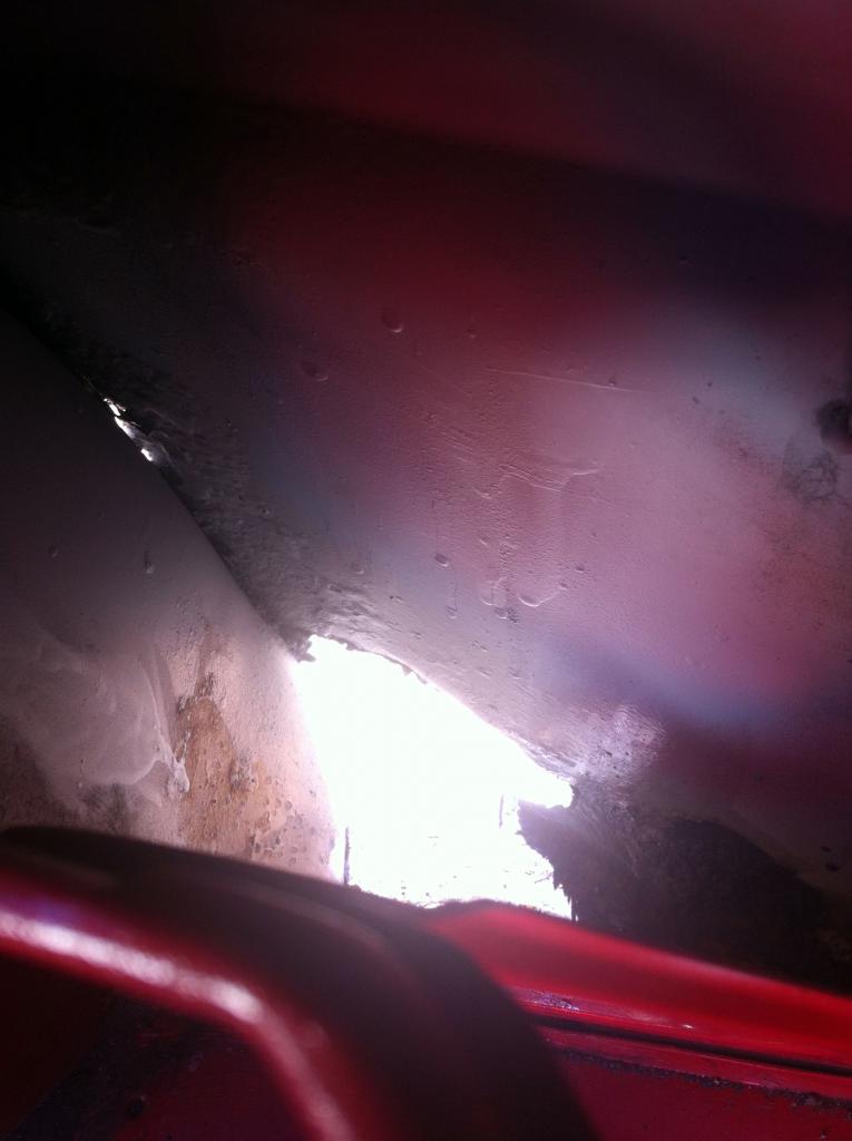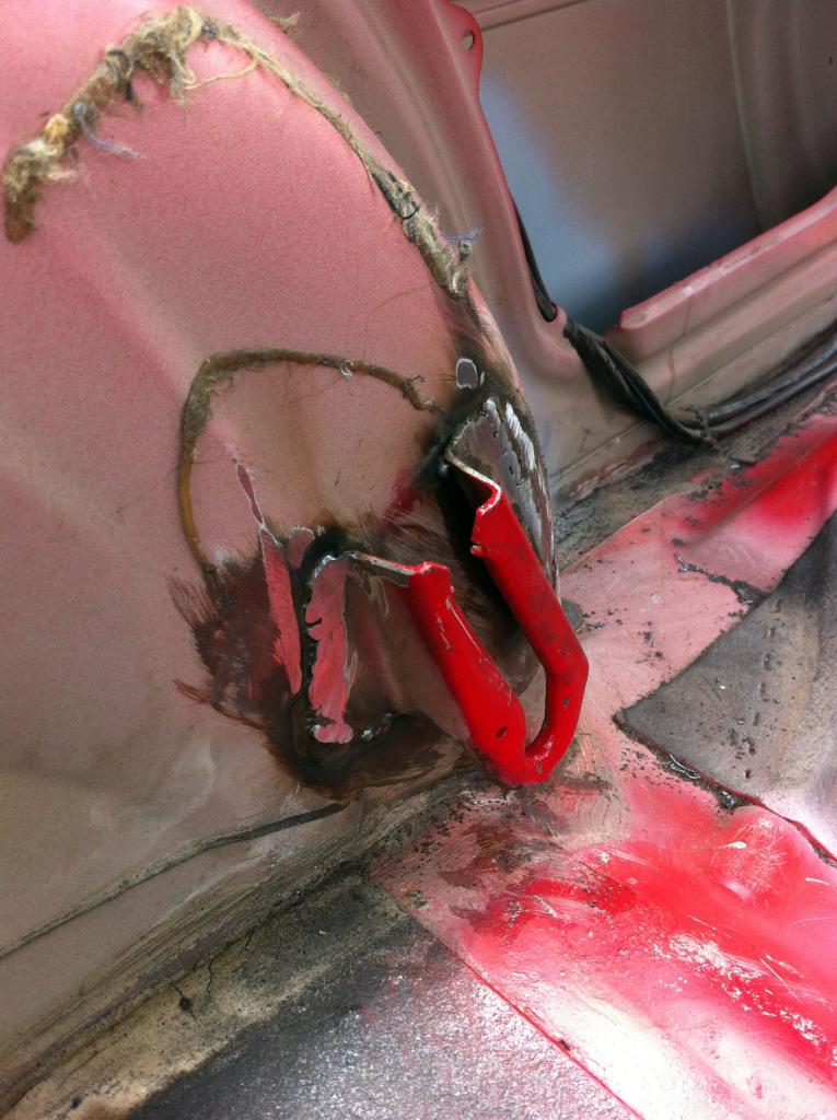3. Los anclajes de los asientos traseros estaban medio arrancados y se habia hecho agujero del guardabarros para dentro, con el consiguiente oxido, asik los arranque, limpie por dentro y fuera, volvi a soldarlos en su sitio y por fuera di convertioxido, aparejo y antigravilla, y por dentro convertioxido, aparejo y pintura: