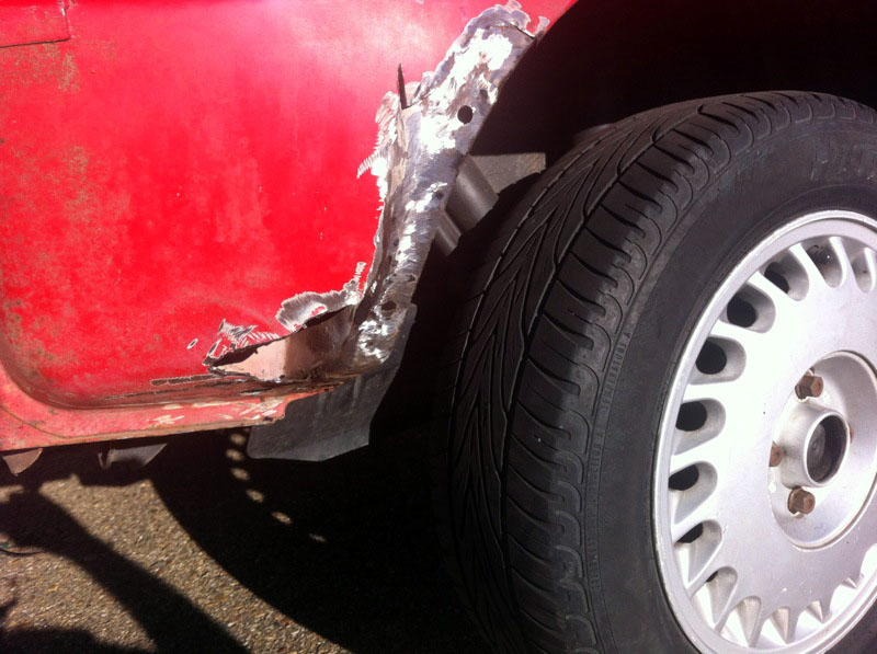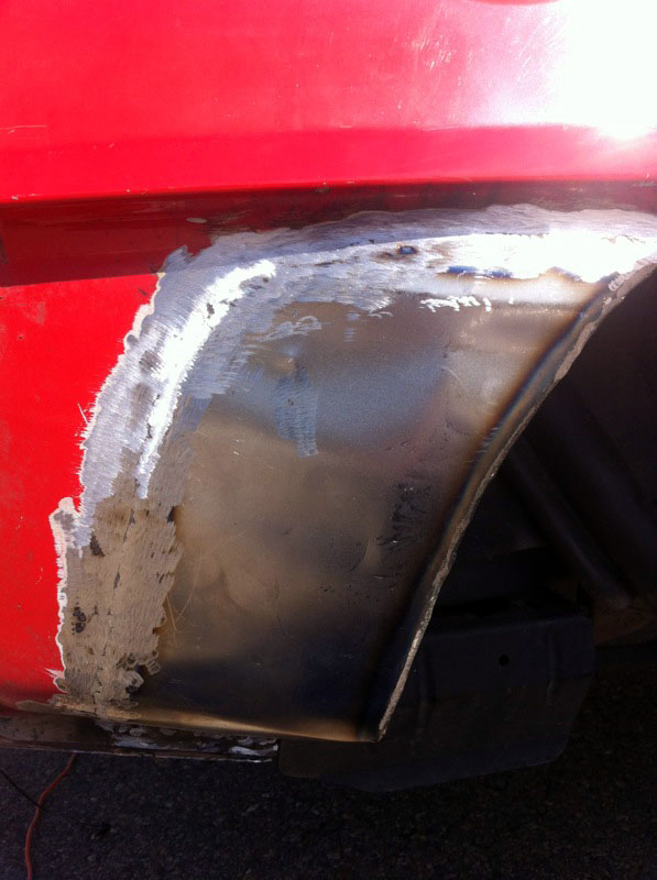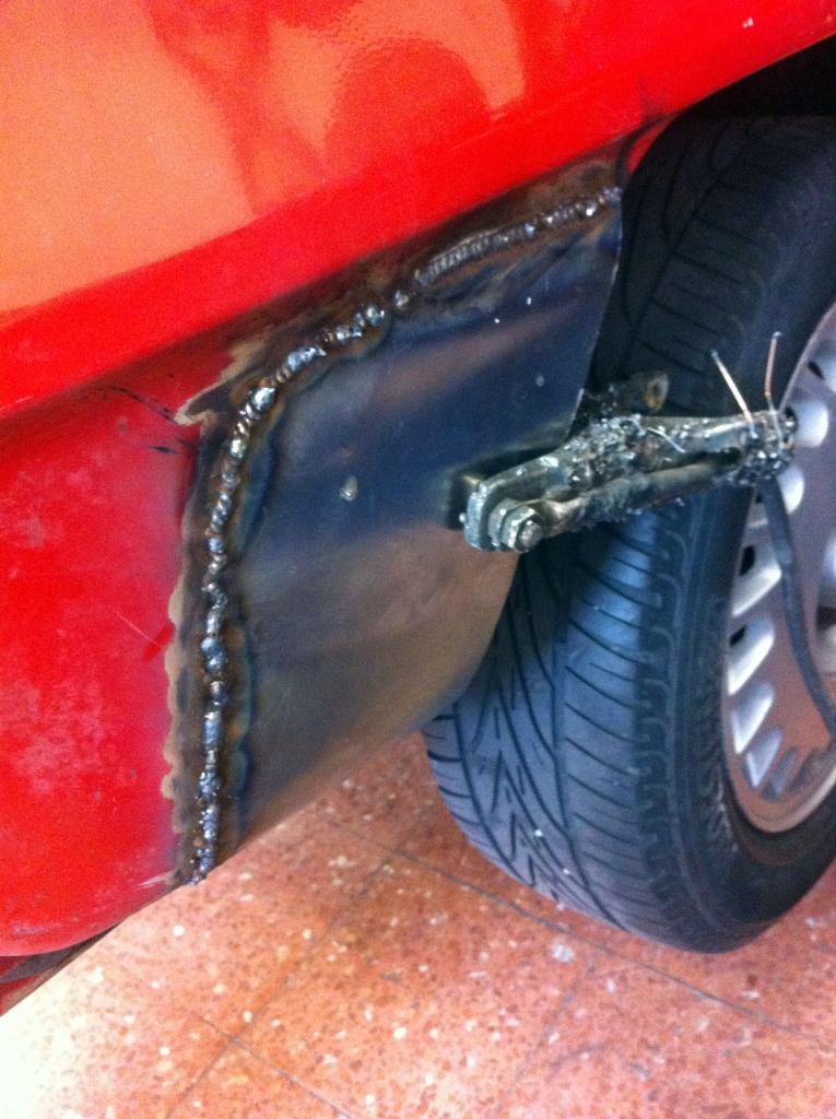 En la aleta izquierda habia mas problema, porque estaba podrida entera, estaba lleno de barro por dentro, yo creo que por culpa de los vierteaguas, asique corte, medi, solde, desbarbe, di aparejo, masilla, aparejo otra vez y pinte, por dentro y fuera (la pintura de fuera no es la misma y tampoco quedo perfecto, es solo para adecentarlo, porque en no mucho espero pintarlo en una chapisteria: