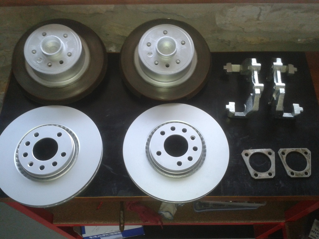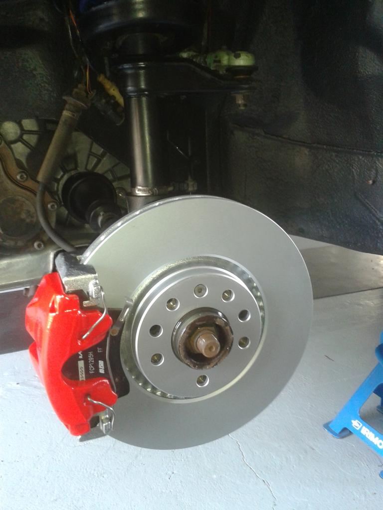Seguidamente me puse con los frenos. Utilicé los bujes del saab para pasar a 5 tornillos. Compre un kit de brakes, discos de 308 mm y pastillas de Saab Aero , aprovechando mi pinza At FN3 57/25, procedente de un vectra B, y que es igual que la del saab.