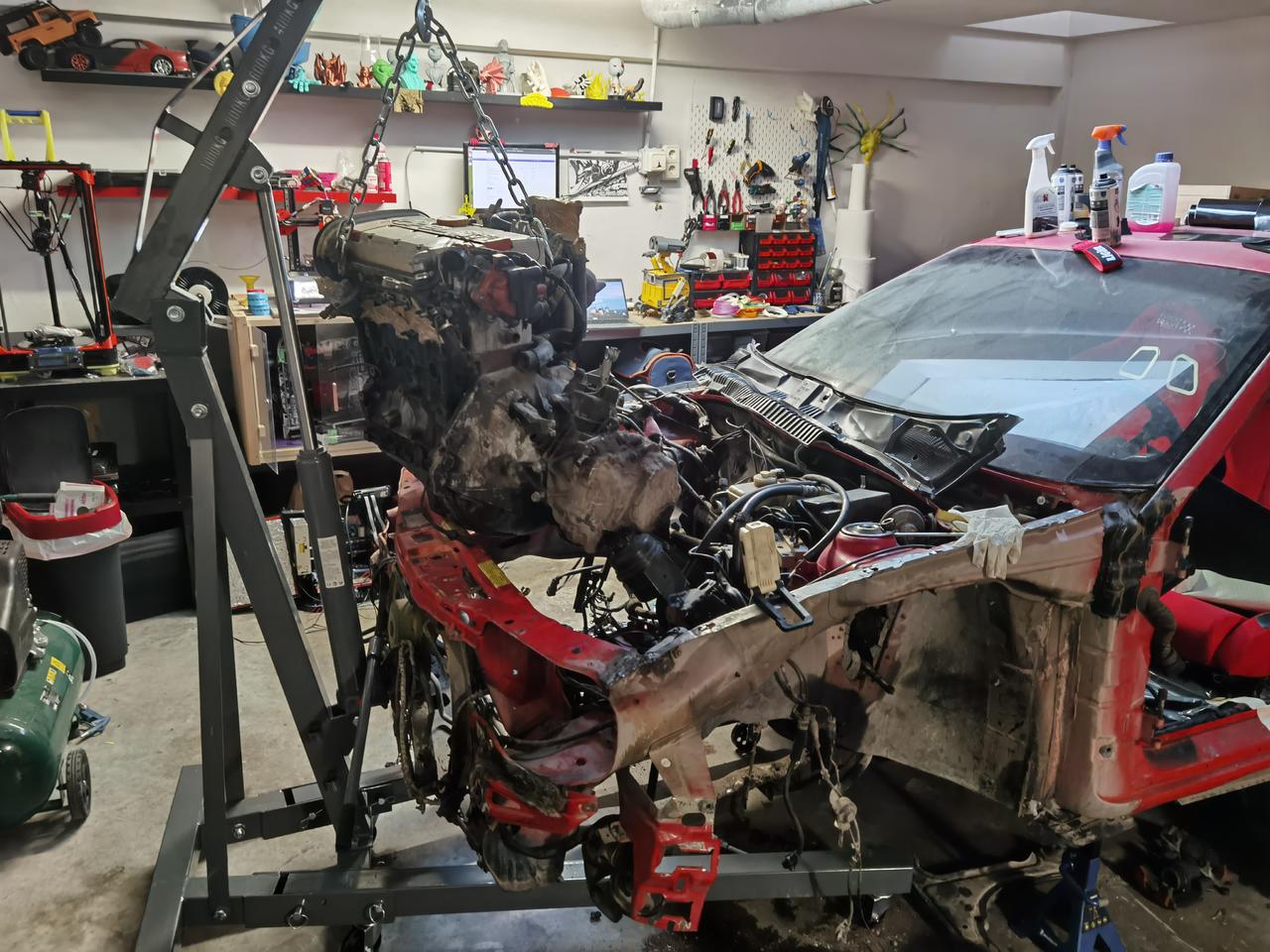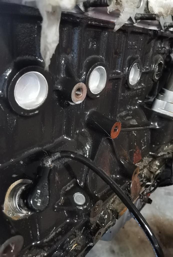 Y aqui una foto de lo ultimo que he hecho, hable con mi amigo mecanico (el que me regalo el coche) y me dijo que ya puestos a ponerlo al dia, lo abriamos y cambiabamos casquillos de biela y demas, asique me compre una grua y con paciencia y preguntando por whatsapp a mi amigo, he conseguido sacarlo en mi cochera jejeje