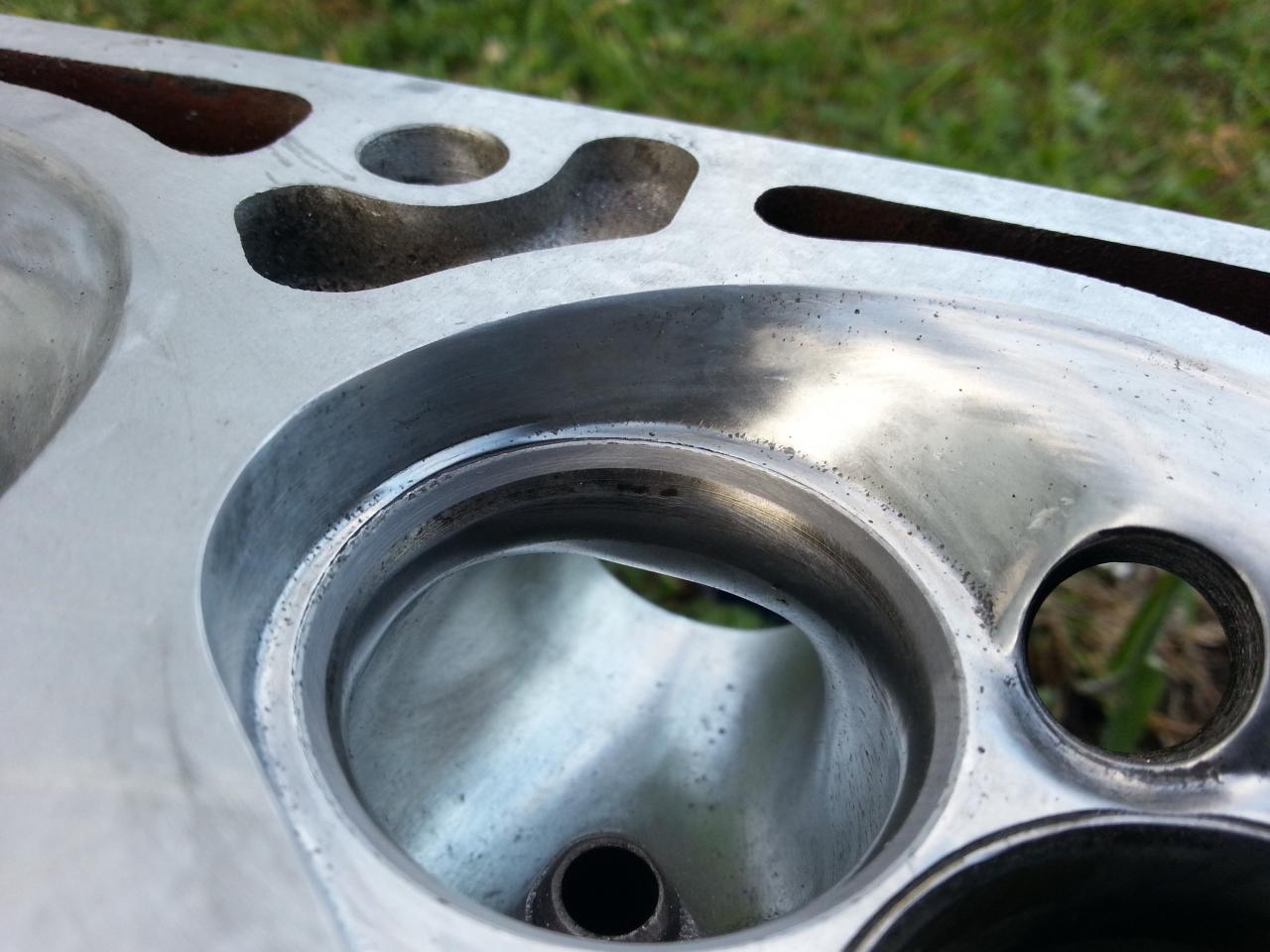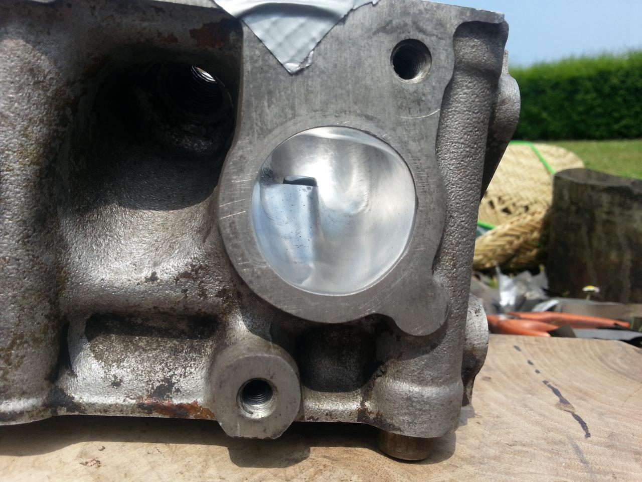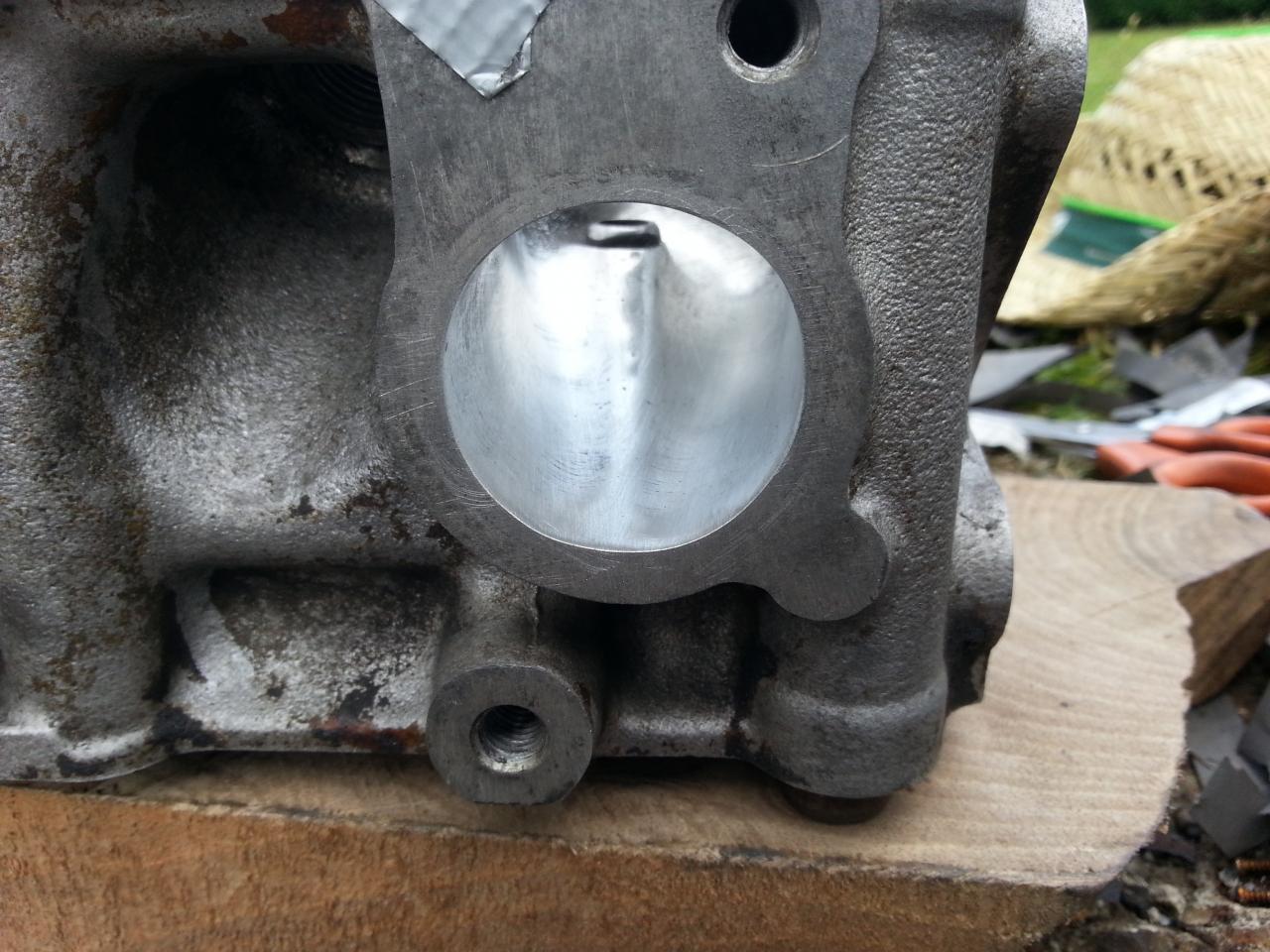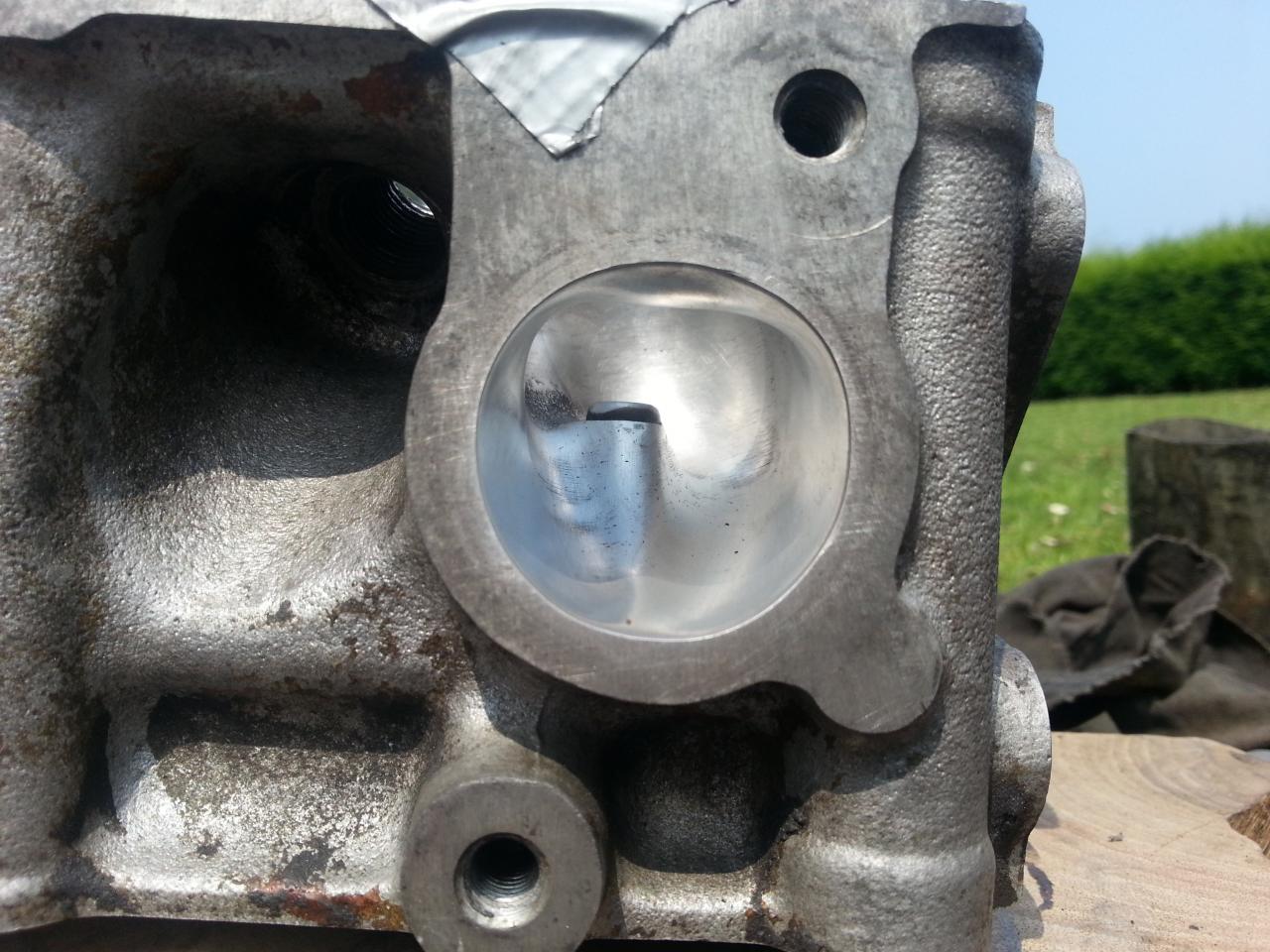 Porting de admisión, no conviene pasar de P220, tengo leido que es con lo que se obtienen mejores resultados. Las cámaras, pulir un poco y sobre todo no dejar aristas vivas, o al menos suavizar todos los bordes posibles de las cercanías a la válvula de escape sobre todo, y proximidades de la bujía.