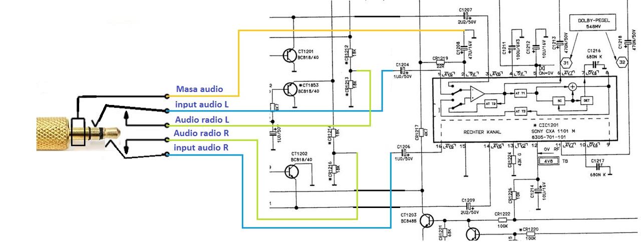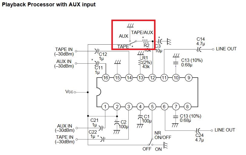 Lo que no termino de ver claro en el esquema es que la conmutación de AUX y TAPE sea automática al recibir señal por el AUX... Hay una conmutación de masa a positivo para el pin 12 que no sé si se hace físicamente por un interruptor al meter el cassette o cómo se genera.