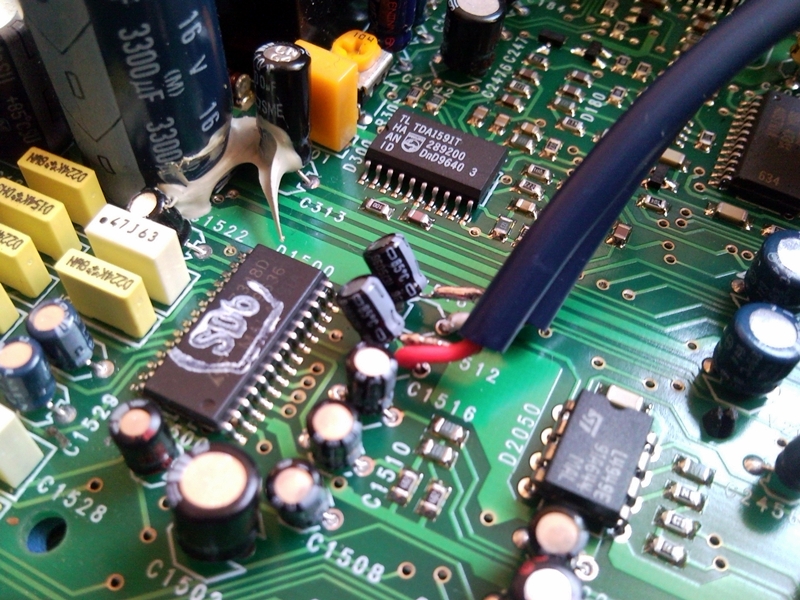 La explicación práctica sería: desoldar la patilla negativa de los condensadores C1204 y C1206, soldamos los cables verdes en la placa donde iban soldadas la patillas de los condensadores y las patillas negativas de los condensadores que hemos liberado soldamos en cada una un cable azul. Y listo, no hay que tocar nada más de la electrónica de la radio.