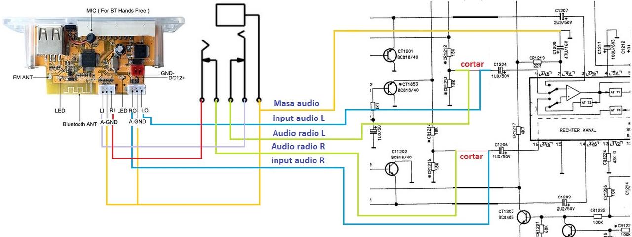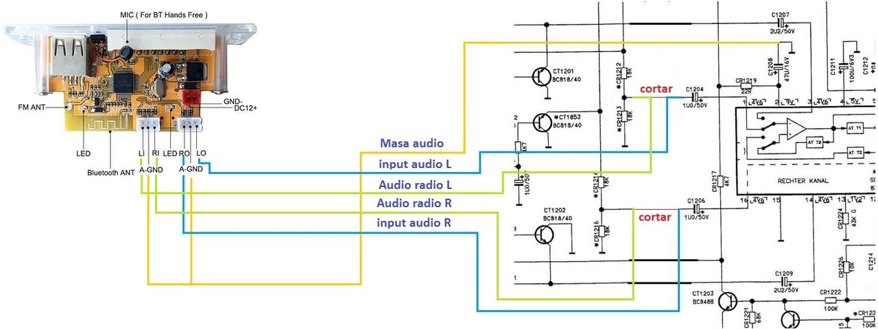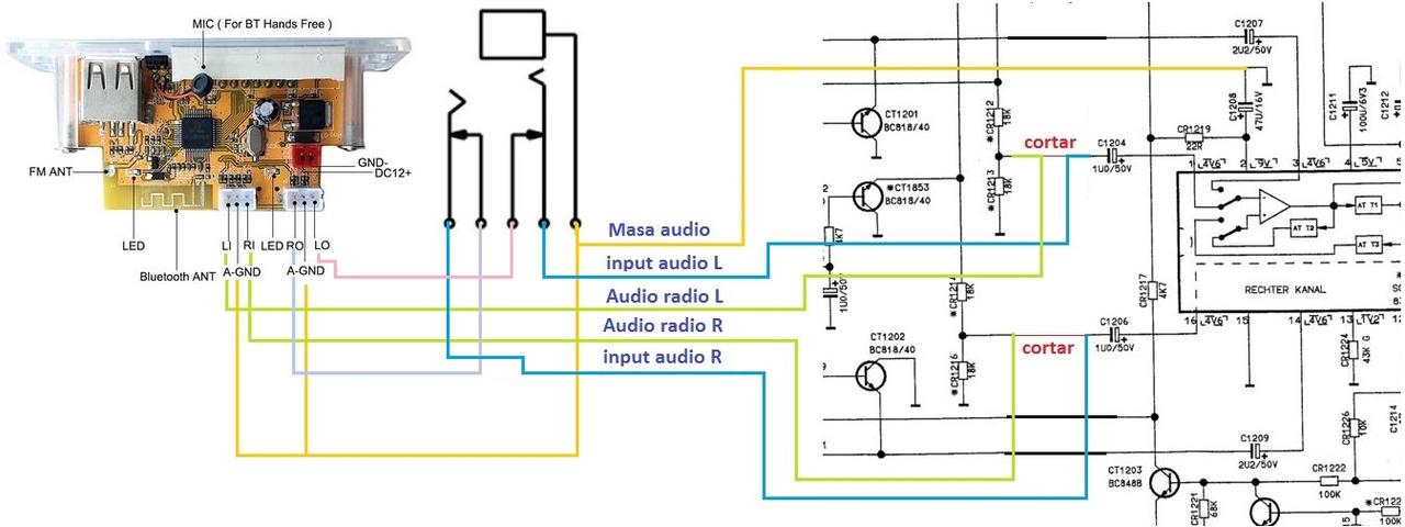 Lo explico de manera teórica (que no practica) con la siguiente imagen modificada del esquema de la radio. En la radio cortaríamos la pista de color rojo y en los extremos soldaríamos los cables azul y verde tal y como aparecen en la imagen.