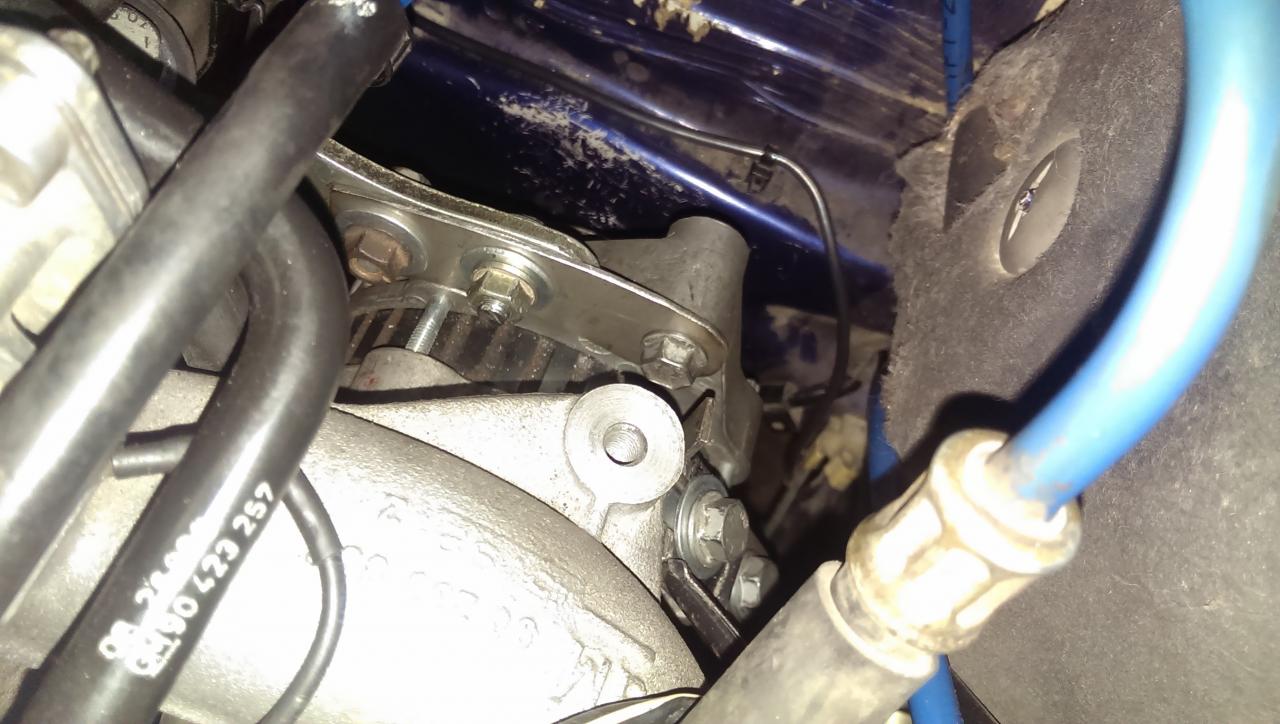 Tambien hubo que extender el soporte original porque al ser el nuevo alternador un poco mas ancho varía la posición para tensar la correa. Añadido también otro soporte para el tornillo trasero, unido al colector de admisión.