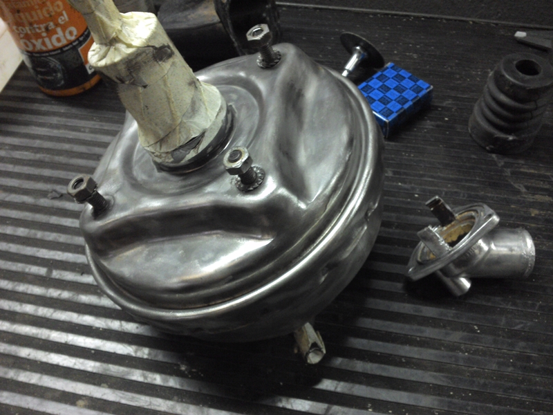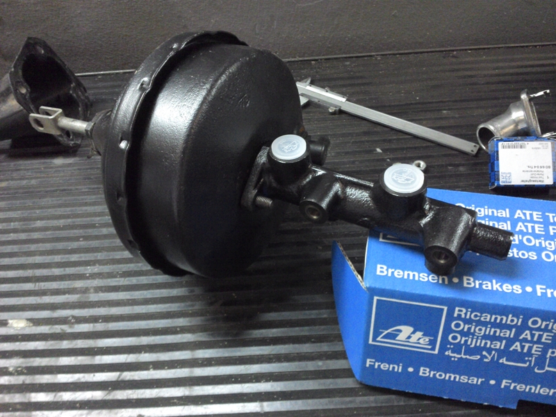 Después de horas de investigar en webs y foros alemanes, conseguí referencias de lo que en principio es el mayor servo aceptable en el vano del Kadett (8'' frente a 7'' de serie) con la mayor bomba (23,81mm frente a 20 de serie). Y una vez llegadas las piezas, arman entre sí y unen al pedal perfectamente ;) Bomba nueva del trinque
