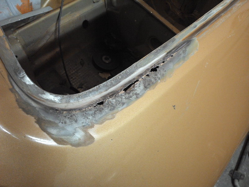 Aprovechando que tenía el rotalín en la mano, quise investigar qué eran un par de puntitos en la pintura del portón... chapuza al canto reparada con masilla. De lo malo el portón es la única pieza que se veía repintada, el resto del coche parece en estado original. Pero he tomado la decisión de llevar el coche a chorrear a cabina, resetear de cero, no quiero sorpresas con él ya terminado.
