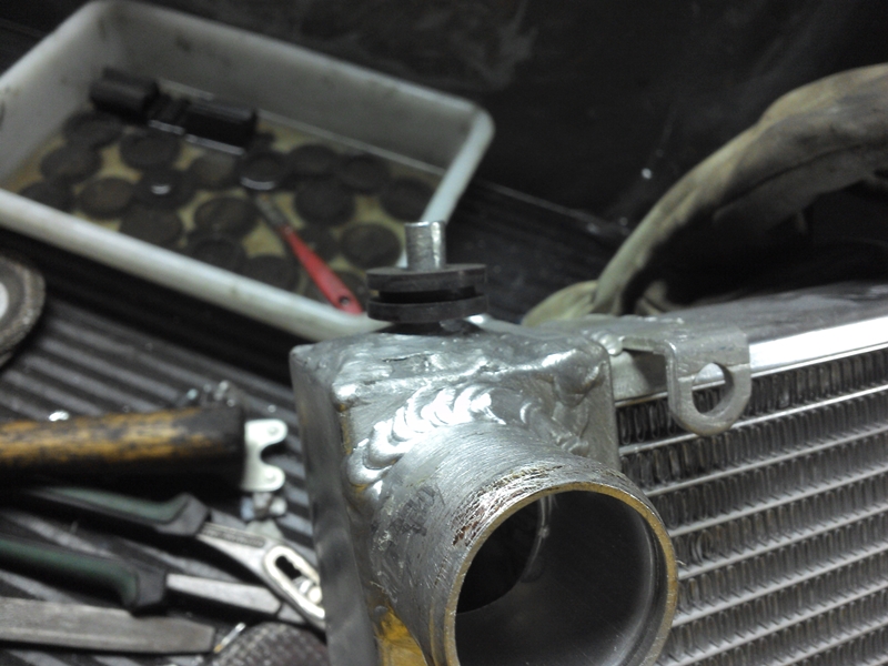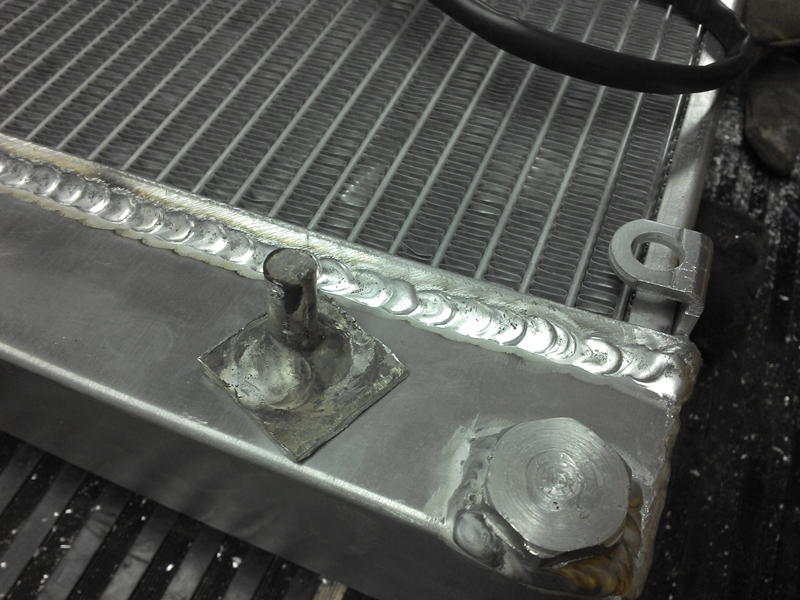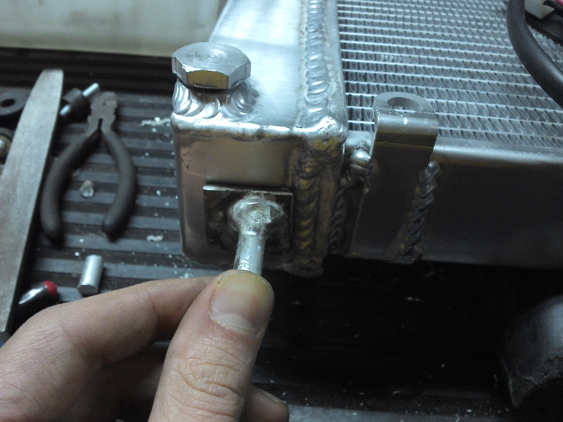 No me gustaba mucho cómo quedaba anclado el radiador en la parte baja, lo veía muy suelto y me daba miedo que se saliera. Así que lo modifiqué. Opté por soldarle unas espigas de alu como traen muchos originales.