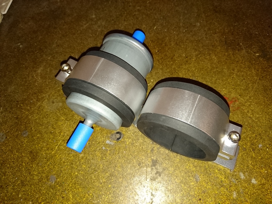 Soporte de alu para bomba de gasofa y filtro. Pienso fijarlos en una plancha de aluminio a su vez cogida a la carrocería flotando sobre silent-blocks, donde colocar también el regulador de presión. No voy a montar línea de retorno desde el vano, sino que el regulador va a ir junto al depósito.