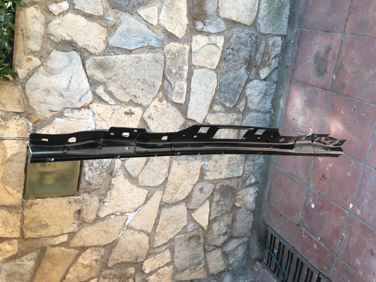 Después de restaurarlas, pintarlas y montarlas, me di cuenta que habia algo raro en las molduras de los parachoques. Resulta que años atras mi padre las intentó apañar y les quitó el listón metalico que va encima, y por lo visto no són faciles de encontrar, así que a ver que me invento.:cool: