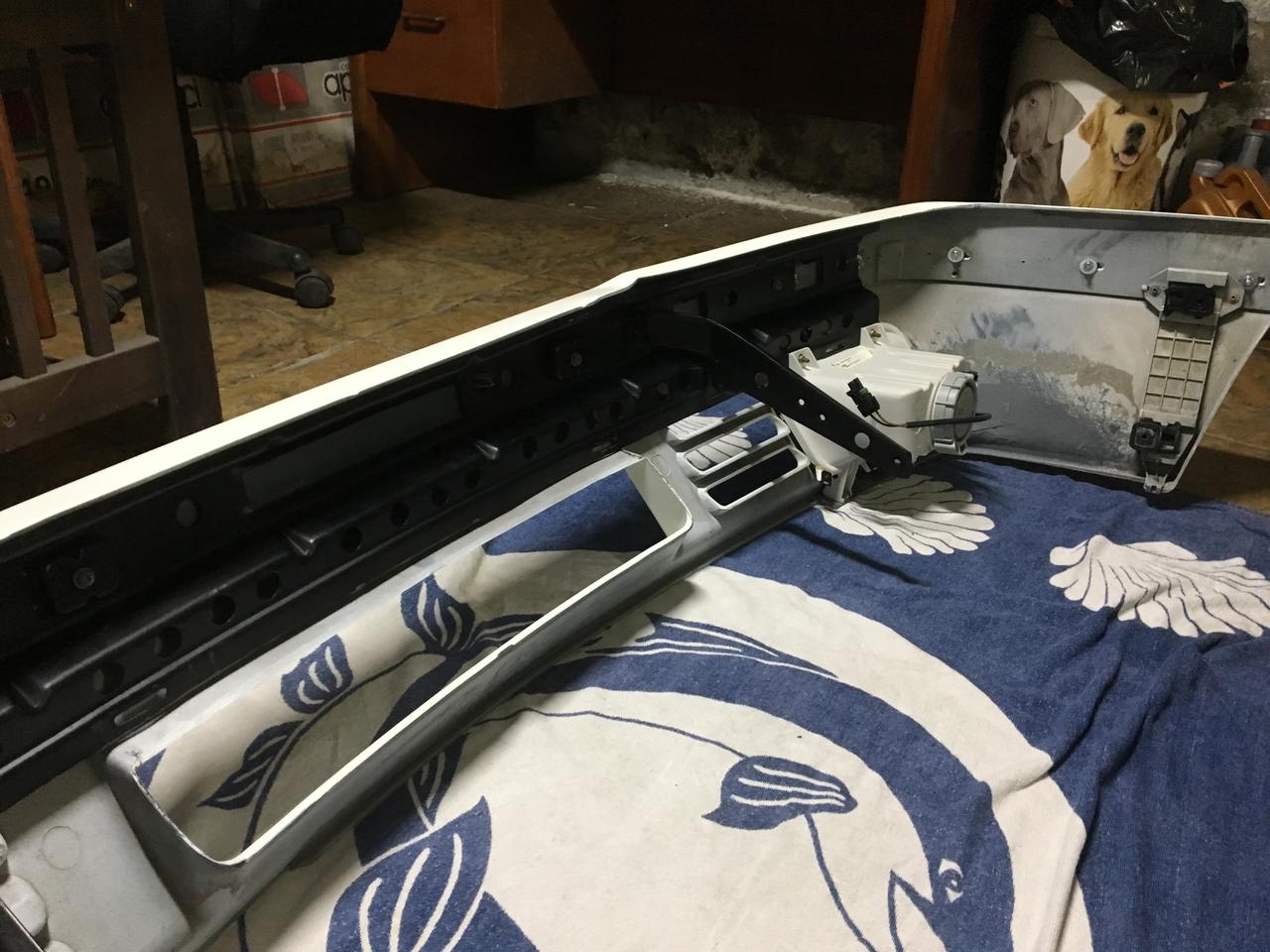 So montó una reja frontal de segunda mano, pero en perfecto estado, que aun conservava las 3 patas de sujeción, y aunque los emblemas eran cromados, los cambié por los que habia pintado y listos: