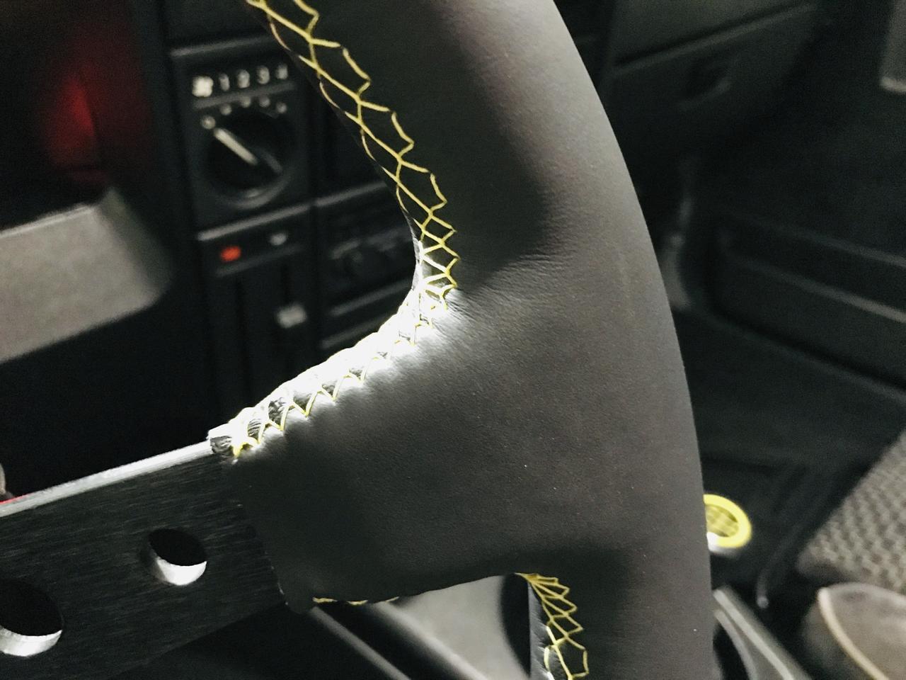 Pero basta de problemas, también hay que enseñar las cosas que quedan bien. Os dejo una foto del volante tapizado con piel Nappa lisa y cosido en amarillo;)