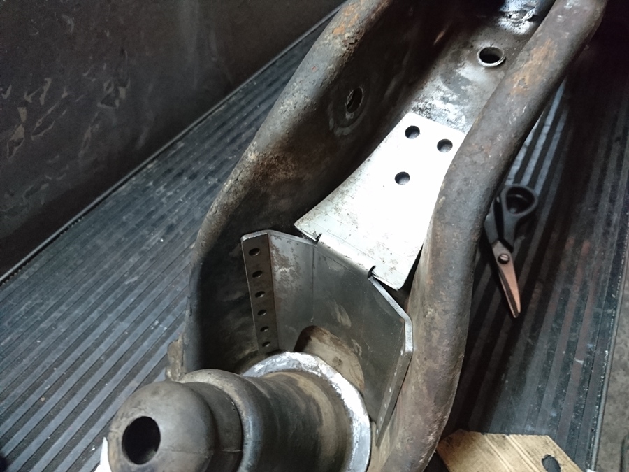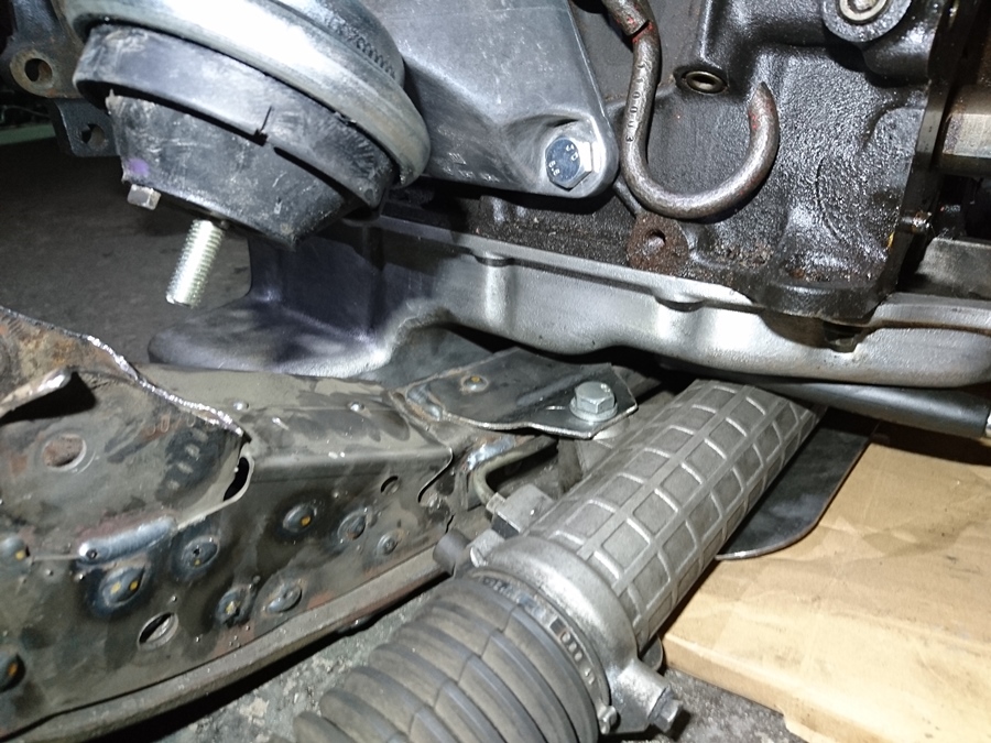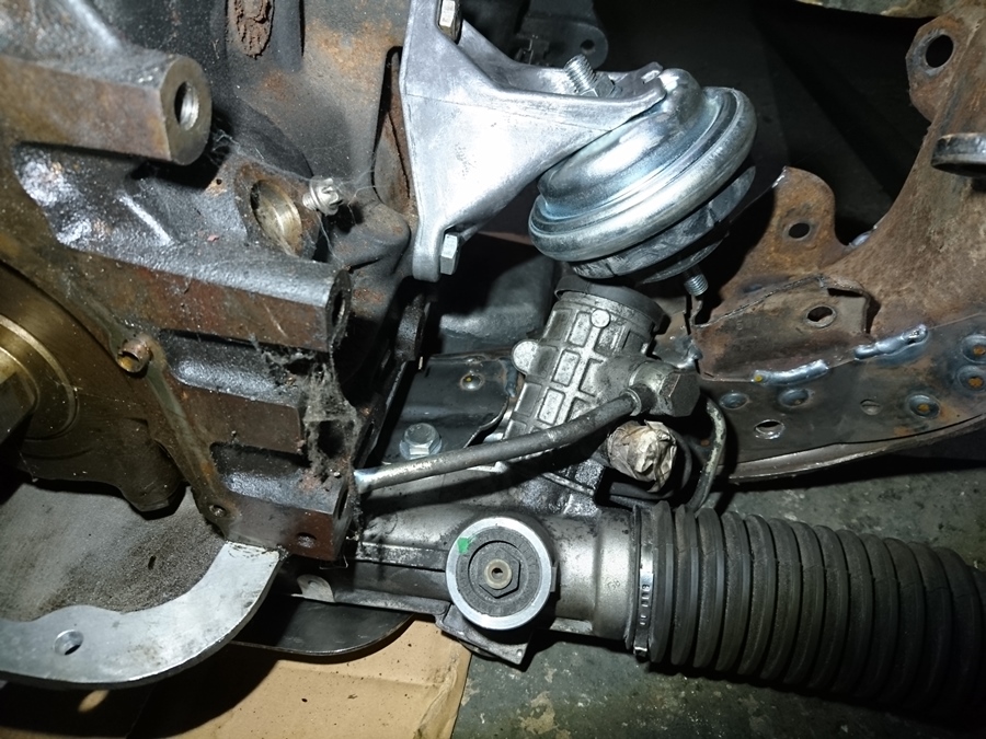 Para el taco de la cremallera se me ocurre que puedes hacer un suplemento con pletina de 10, atornillarla al soporte de motor de aluminio en su tornillo y taladrarle otro mas abajo; y atornillar el silentblock un par de cm mas arriba en otro agujero, asi puedes fabricar el soporte del chasis dejando libre el espacio para la caña de dirección.