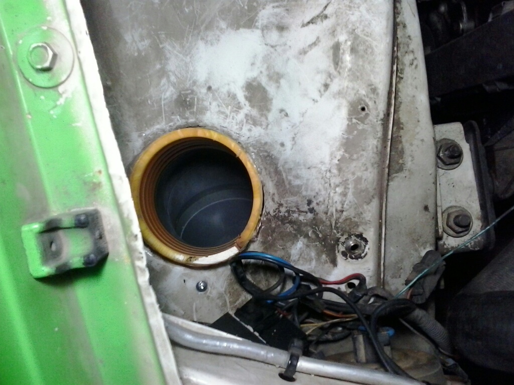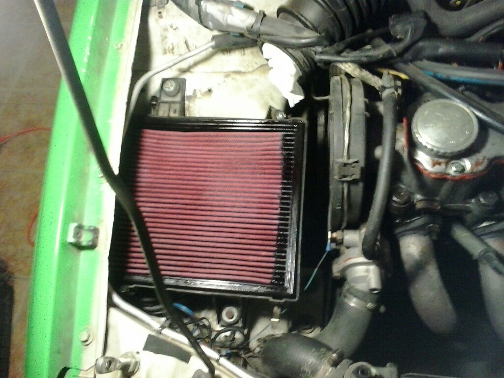 - Conducto de admisión Ram Air: hasta ahora llevaba un tubo de 7cm de diámetro que iba directo desde el hueco del antiniebla hasta la caja del filtro, a modo de sistema Ram Air de entrada de aire forzado, que si bien no se suele aconsejar su uso tengo que decir que yo lo llevo y el coche realmente me va muy bien. Este finde mejoré el sistema: hice una campana de admisión con fibra de vidrio del mismo tamaño que el hueco del antiniebla para maximizar el total de aire que pueda coger (en la foto no se ve que coja todo el hueco, pero sí lo coge, simplemente es tema de profundidad, la campana queda algo reculada).